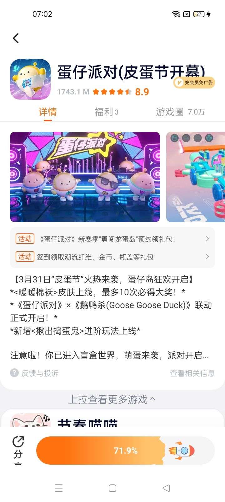 【3月31日“皮蛋节”火热来袭,蛋仔岛狂欢开启】 *<暖暖棉袄>皮肤上线,最多10次必得大奖!* *《蛋仔派对》×《鹅鸭杀(Goose Goose Duck)》联动正式开启!* *新增<揪出捣蛋鬼>进阶玩法上线* 注意啦!你已进入盲盒世界,萌蛋来袭,派对开启!《蛋仔派对》是一款潮玩题材的休闲竞技手游,在这里你将化身Q萌蛋仔,加入热闹非凡的闯关派对。让我们一起撞走不开心,结交好碰友! 海量关卡,陷阱机关,争先恐后往前冲!奔跑、跳跃、翻滚,发生超真实的物理碰撞!百变外观任你搭配,潮流、酷炫、萌趣的盲盒等你收入囊中!更有零门槛地图编辑器,DIY你的专属关卡!