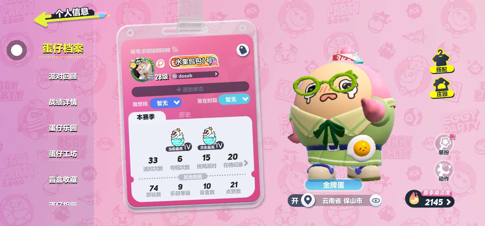 找蛋搭,28级最高历史段位鸵鸟蛋,几乎每天都会上线,一般是下午😘本人是女的🙆