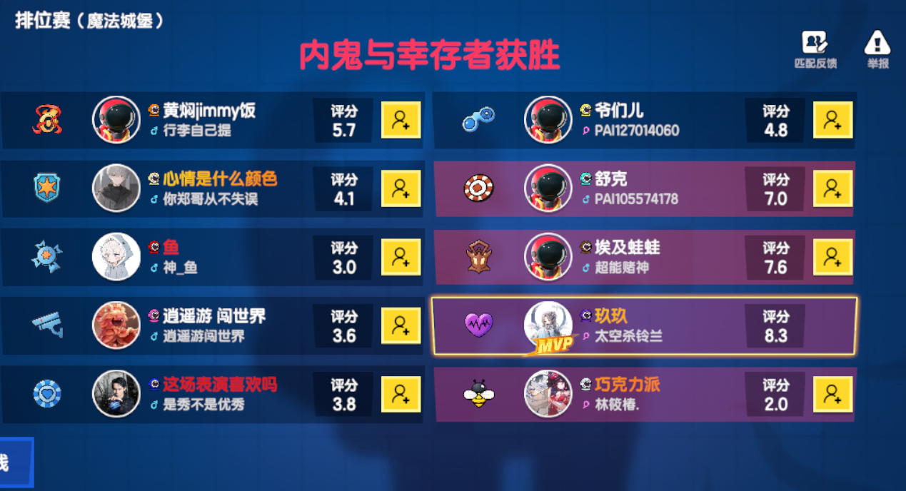 排位赛玩幸存者,恶魔开局被刀。内鬼刀到武士,另一个内鬼被卧底骗。左边一排在看戏。右边一排在挣吵