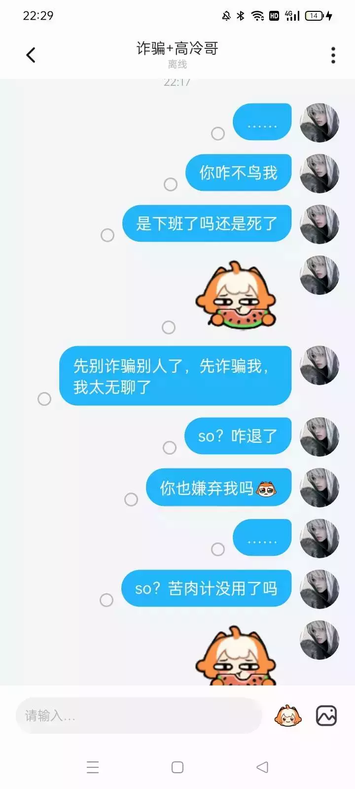 ……你知道的,我没有安全感,就因为这点我有时会发疯或身体不适,比如失眠2~4天……我受到欺负不敢反抗别人,我怕我会有麻烦,我也不会主动告诉你,我怕你有负担…你能理解我的,对吧?
