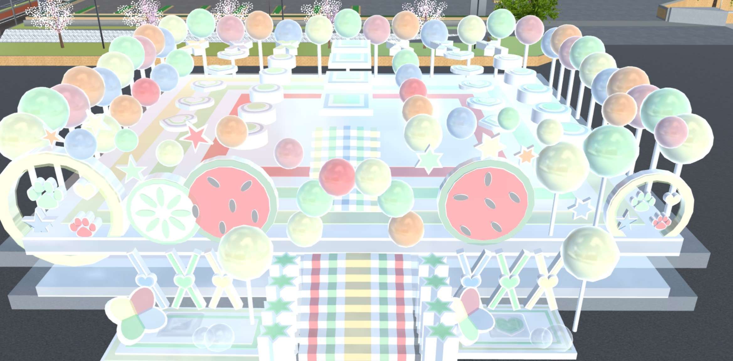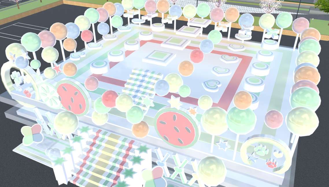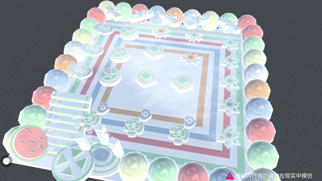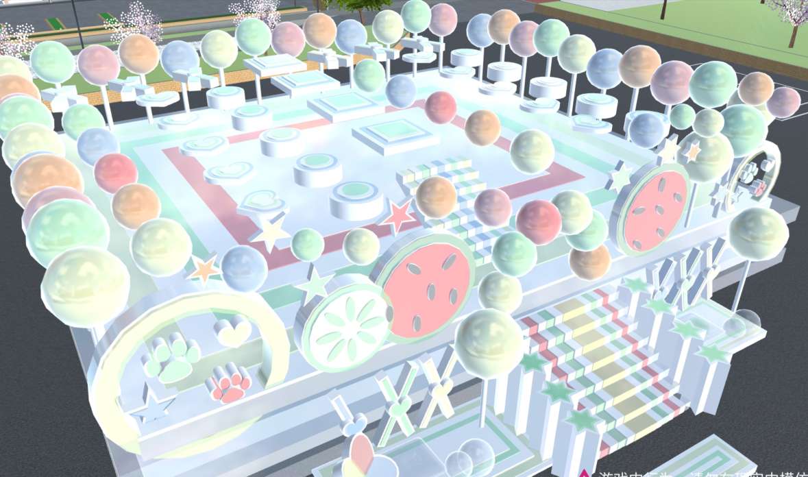 其中的夏日元素有西瓜🍉、柠檬、棒棒糖🍬👌,在元素中杂有许多图案,两侧有两个打卡点,差不多一样💩,这是以红黄绿橙蓝色为主,色彩鲜艳分明
