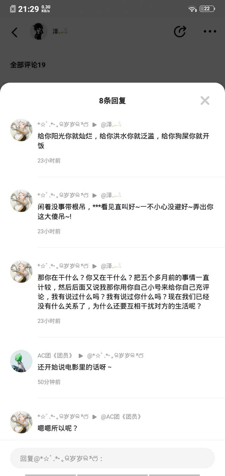 所以呢我能不委屈吗?一开始你在心舞上发帖子cpdd下面一群人说你太小了我说的是不要在该动笔的年纪动情,而你呢?对,我有*行了吧难道你没有吗不喜欢可以叫我删,而你骂我什么意思啊对你小迷妹很多我人气不好,也没有小迷妹官方为什么要封你?为什么不封我?没有想过吗?💩我记得从那件事开始你被封了三次😂👉“[小丑]"我也骂你了,但我好像一次都没被封耶😂证明什么?你先惹我的~😂那你们有些人肯定会说我没被举报,官方为什么要封我😂拜托,那件事下来很多人都举报我了,好吧。还跑来我评论区跟我说然后再在他们的帖子里面发某某我已举报😂什么跟什么呀😂还有“岁岁″你只发我们骂你的,那你骂我们的那些帖子被你吃了吗😂