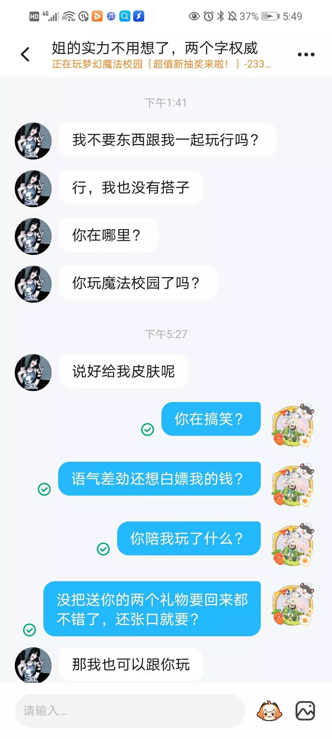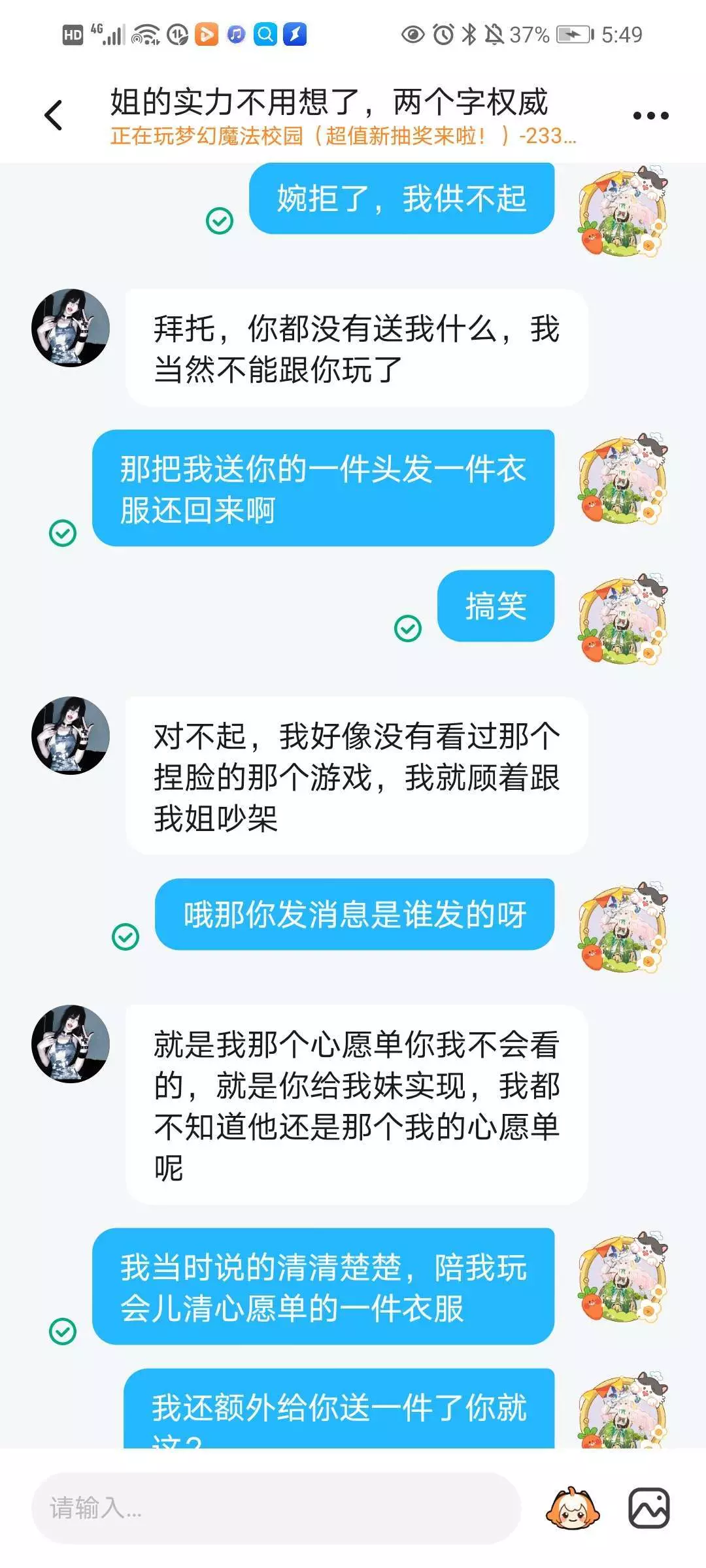 引以为戒!引以为戒!引以为戒!在今天,瓜主一个人玩无聊。想找陪玩又不舍那三瓜俩枣,干脆犯神经用喇叭问有没有人愿当瓜主的临时搭子,可清一件心愿单。而这位“姐的实力不用想了,两个字权威”看见后直接发送好友审请,通过后一直发求求你了这种话,瓜主有点奇怪但因为找到人了还是答应了,让她选好换哪件后直接说。而她说选好了后,我还在想着对面的心愿单要不要多清几件,于是送了俩。一头发一裙子,她不满足,要求给两套衣服。当时我悻悻的和她讲道理,表明不用她当陪玩了,对面直接删掉或拉黑我,我失手删了聊天记录,当时根本没想到要发贴子。而对面下午1点又来纠缠瓜主,瓜主和她吵了起来,而最后结果是瓜主破防发警告贴。聊天记录挂上面了,有兴趣的可以翻翻。想约陪玩的一定不要学我贪小便宜呀(对面是未成年,应在5~8岁,手机被管控,家长不允许充钱。我真的后悔😭😭当时为什么脑子一抽舍不得那点钱😭恶心死了)