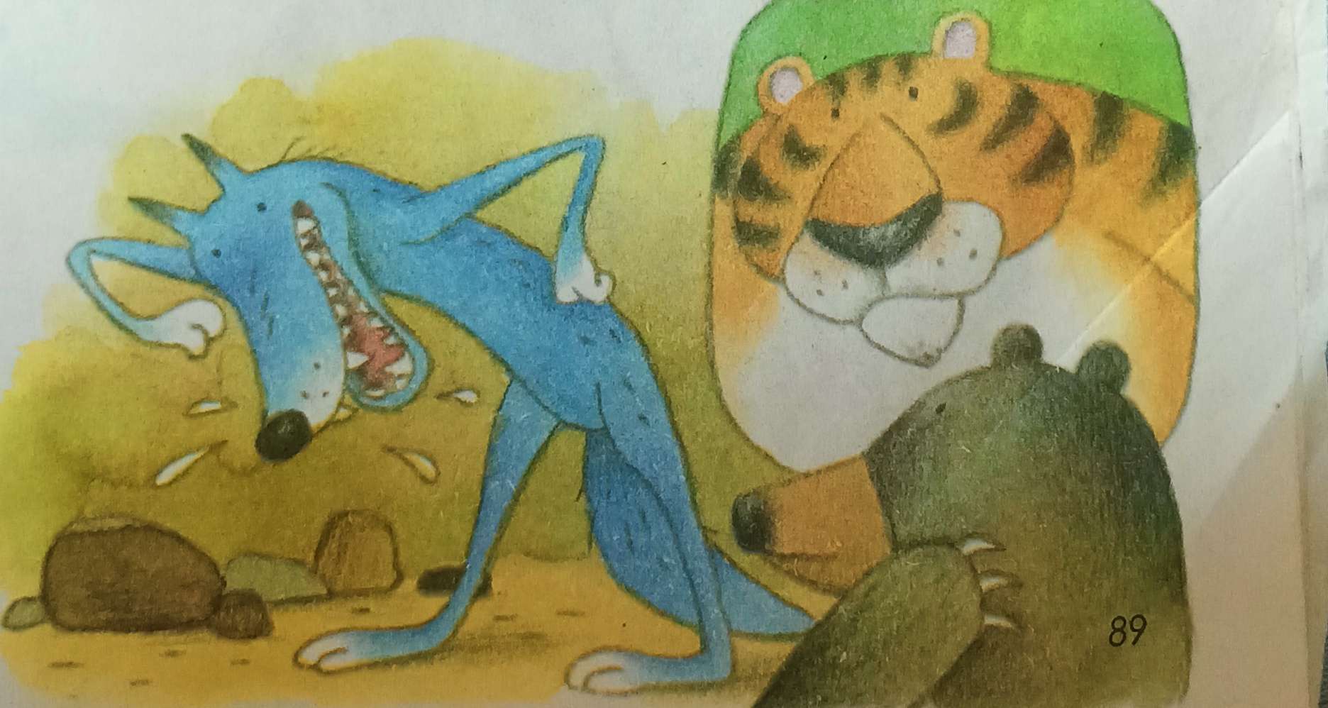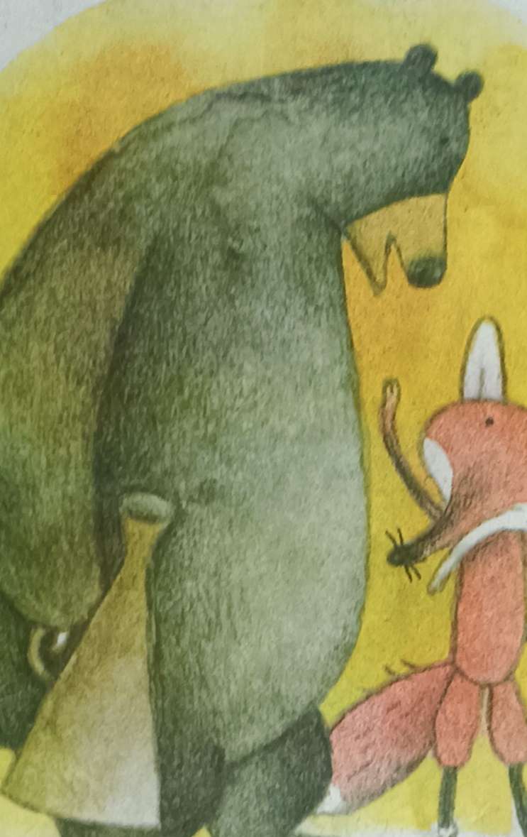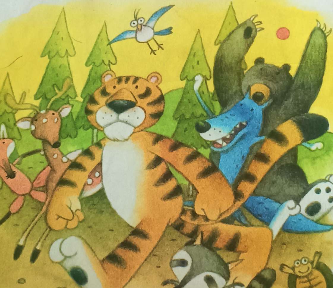 狗熊一听,伸了伸舌头,做了个鬼脸,连忙说:“对对对!"于是就去问老虎。