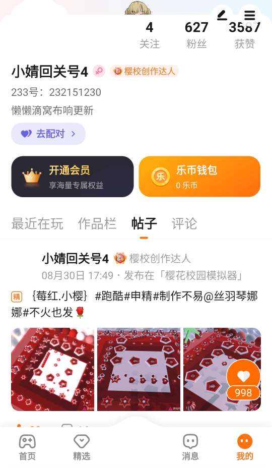 距离上次更新有一个月了,樱校跑酷没灵感,建了跑酷也不火,也对樱校没有什么热爱了……所以退游了,想找人帮我代号,700粉的号我是不容易玩起来的……