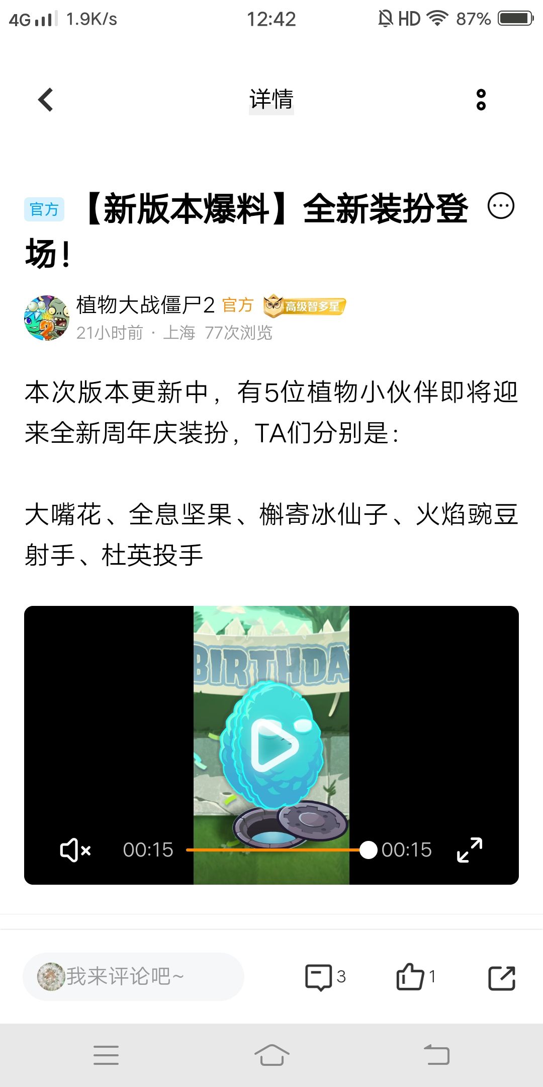 大家好我是充能柚子,植物大战僵尸2更新在8月下旬