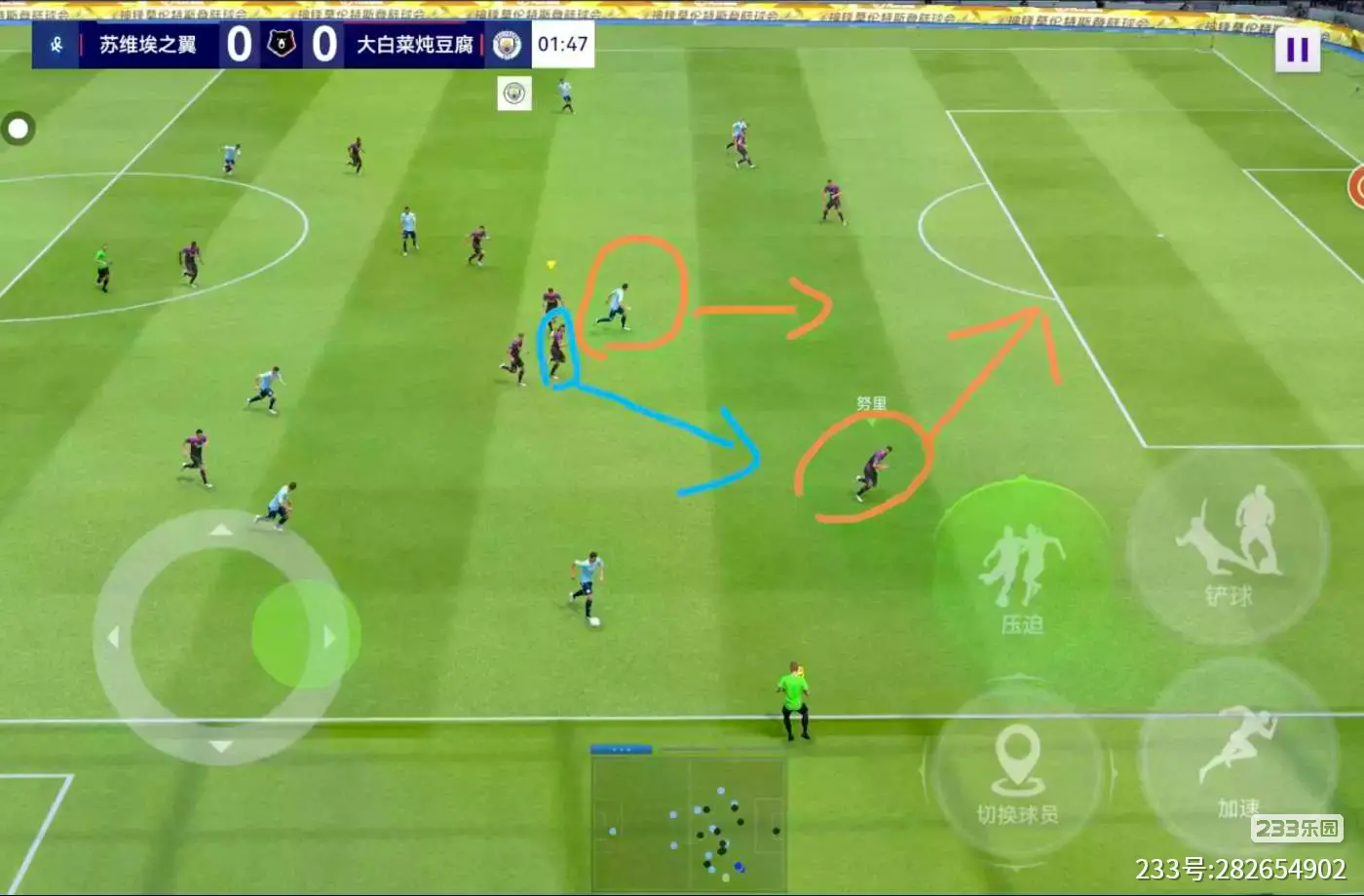 (3)防守情况二:进球后对方开球,此时应如图操作。若预判失败(成功率一般很小),切换距持球球员最近的防守球员,长按加速键补位协防。