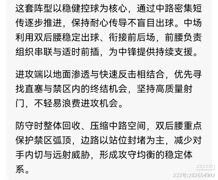 该战术核心是后场控球+纵向反击+短传渗透推进,无论是对现实场上球员还是我们玩家来说,基本技术+头脑+战术理解力显得尤为重要。
