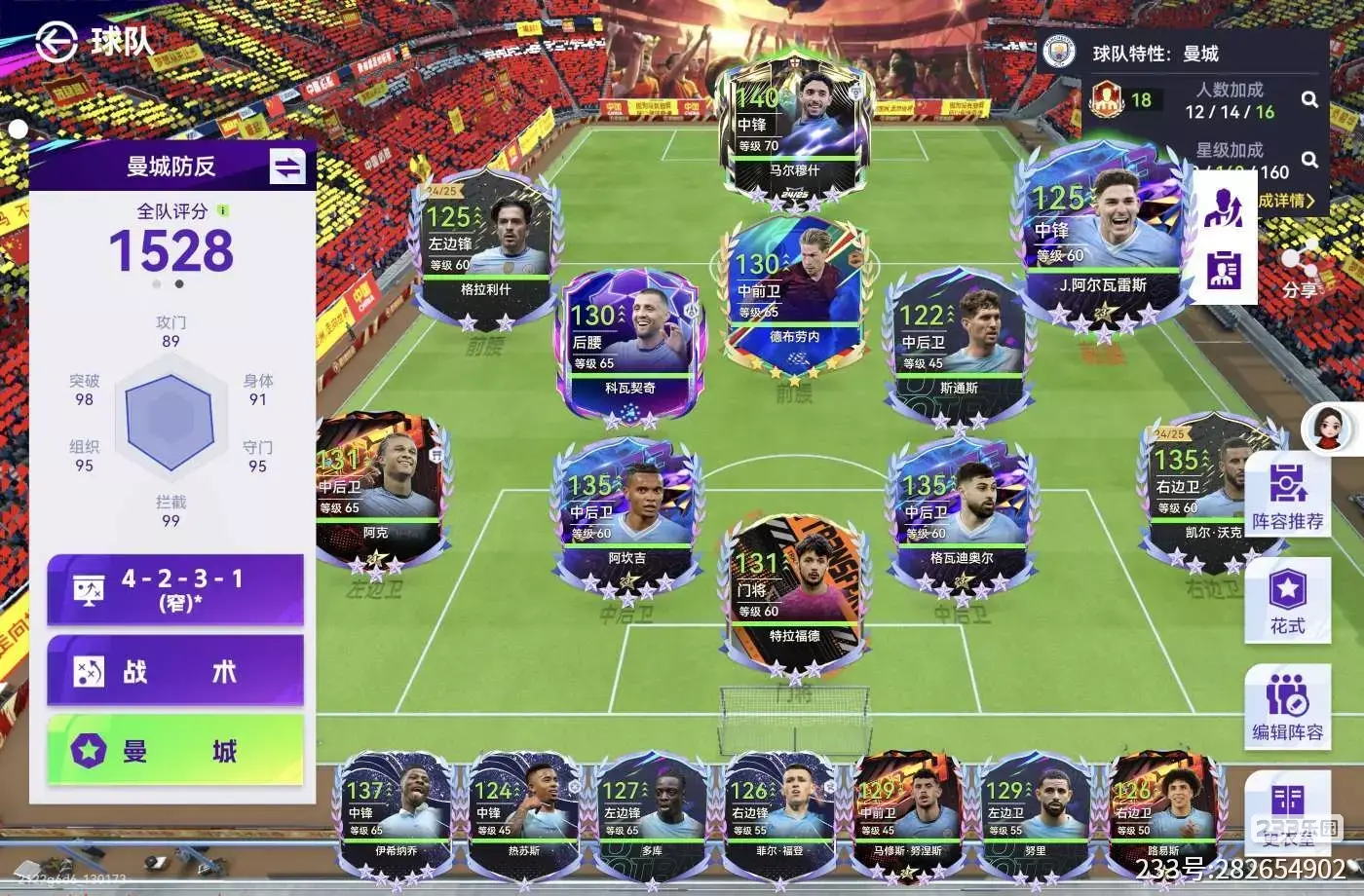 这套曼城4-2-3-1窄阵在天梯实战中整体节奏稳定,进攻端依靠中路渗透与快速传控反击创造机会,牧师作为锋线核心,终结与支点作用突出,配合中场串联,进球效率稳定。防守端依靠双后腰与俩边卫大哥兜底,能有效限制对手进攻,但遇到高强度内切弧线球与数值压制时仍会出现连续失球,致使比赛多以双方对轰上双、小分差取胜/落败。总的来说,这套阵容打法流畅、容错适中,是技术流玩家非常扎实的上分选择。