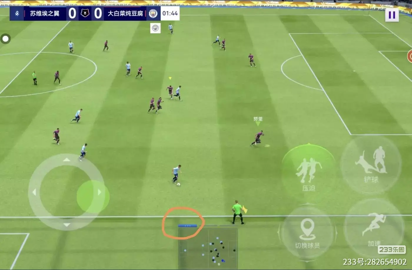 还有比较重要的一点,就是如图所示的情况,直塞时不要只按直塞,手动拨方向杆,选择防线空虚处大力直塞,这样往往能制造不错的机会。