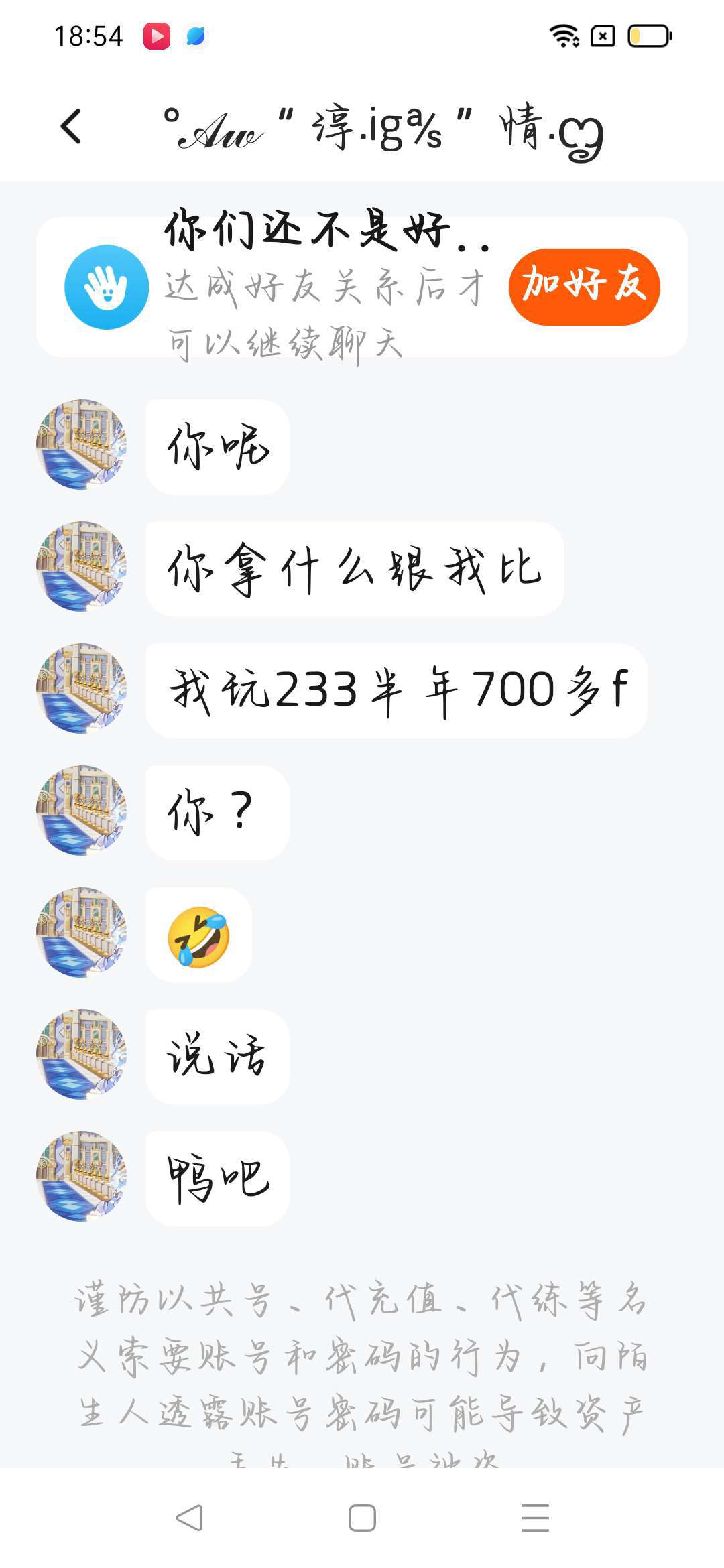 管好自己的嘴,我惹你了吗 ,怎么 ,长大你拿你几万多粉的号给人家看一下 你就可以当老板了 是不是?友谊是拿粉丝比的?也不看看自己心多黑,粉丝也是互来的吧,自己让我发证据 他也不发 ,真的是受不住 ,是是是 我👎行了吧?我做错什么了 你来说说,你还厉害上了 是吧?同样都是一个社会的人 日本人 是吧?没准你叫什么罪 ,自己粉丝多很来 是吧?我不听我不听 已经是一年级的小孩玩的梗了,是是是 你没满18 你有儿童保护法 ,官方不让我发下去 就是剥夺他受教育的权力,承担不起,发不出去 是吧?不行我就报警,看看社会是不是一个帖子能改变的 ,别惹我 ,我急了直接报警