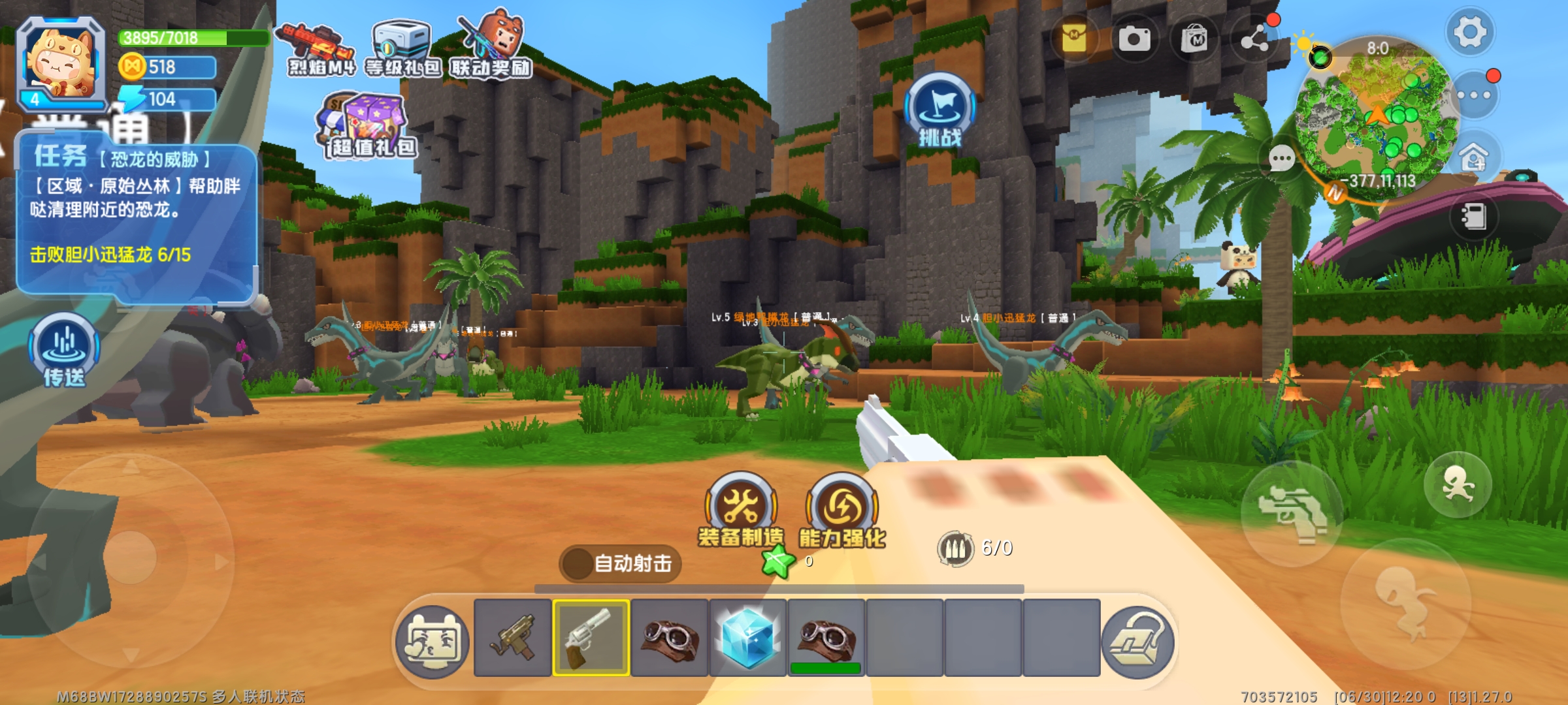 2. 击败恐龙可以用枪(近战用手撸会被攻击且伤害不高,哼哼唧唧)这里建议把自动射击关掉(否则......哼哼哼)打败恐龙有几率获得一些装备和一些材料,如:三角龙的角等。