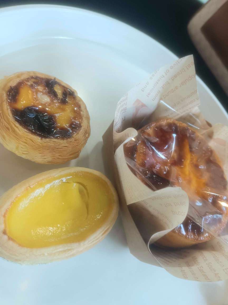 第一个食物蛋挞,花了一块五,还挺好吃,第二个食物好像也是蛋挞,就是中间多了个夹心,好吃,第三个食物应该是面包吧…太甜了,我觉得,一般