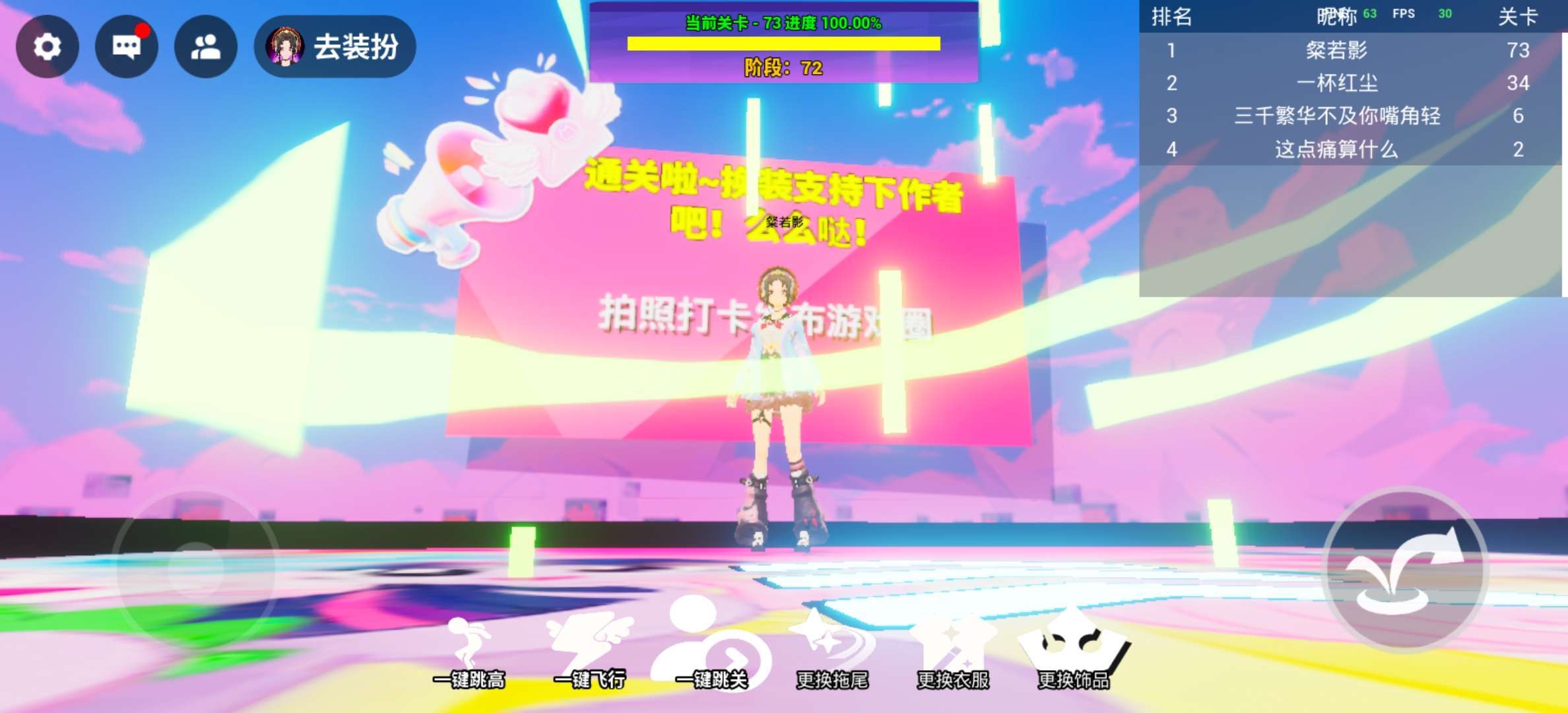 我是跳到,我是跳到了73关,然后就成功了,然后那时候我是第一名