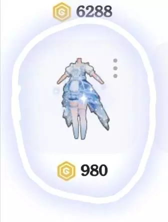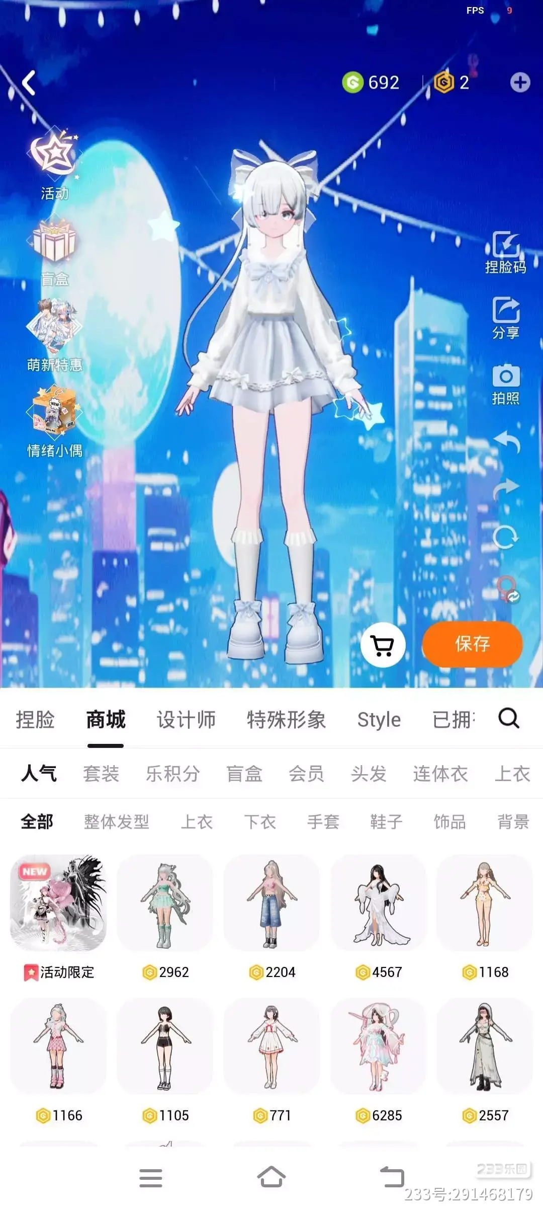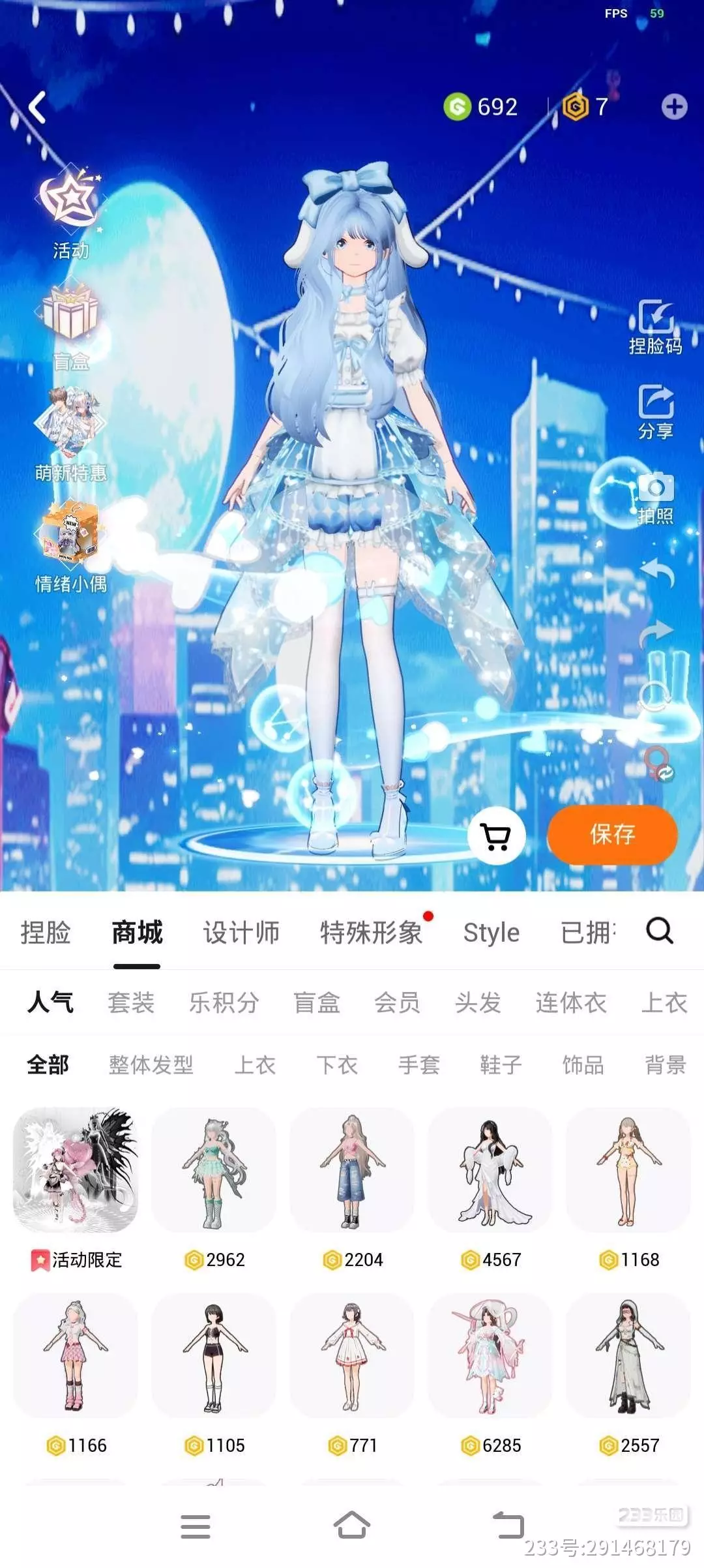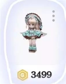 斜刘海,长发,穿着蓝色蝴蝶结短裙,鞋子上也有和裙子上差不多的蓝蝴蝶结,整体颜色为蓝白色,想要的宝子拿