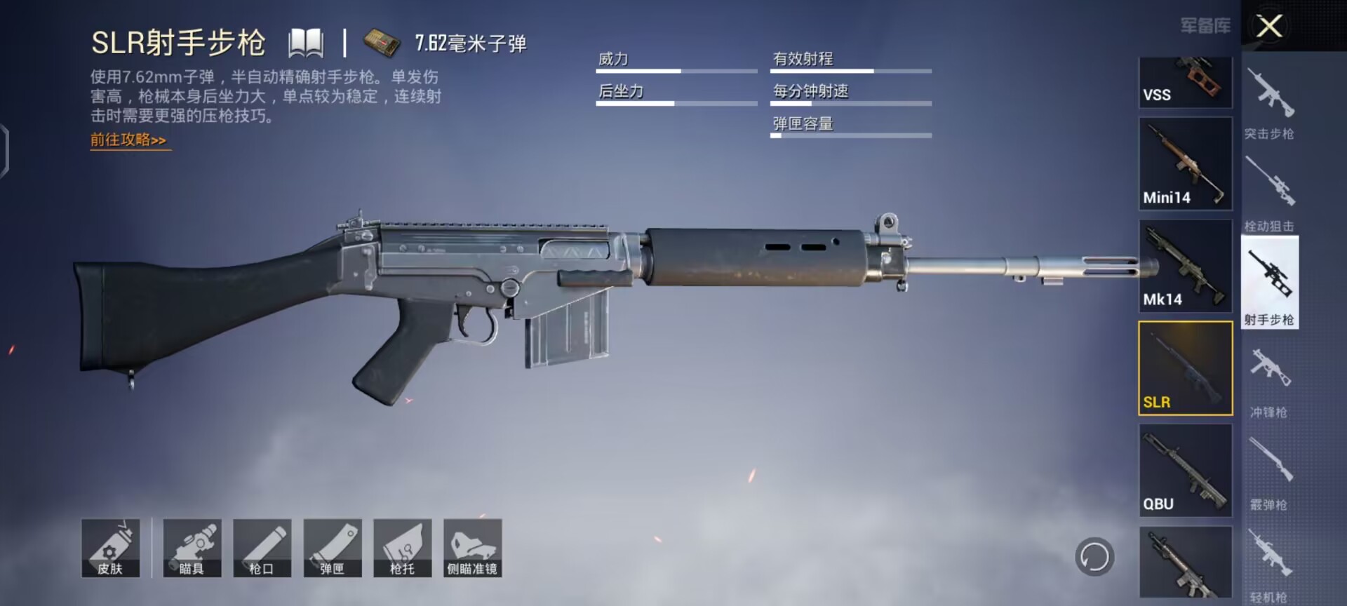 SLR射手步枪:半自动精确射手步枪,使用子弹7.62mm,基础胆量10发,扩容后20发。优点:单发伤害高、射击精准、子弹飞行速度快、远距离射击射击致命部位两枪倒。缺点:后坐力大、不适合连续射击。