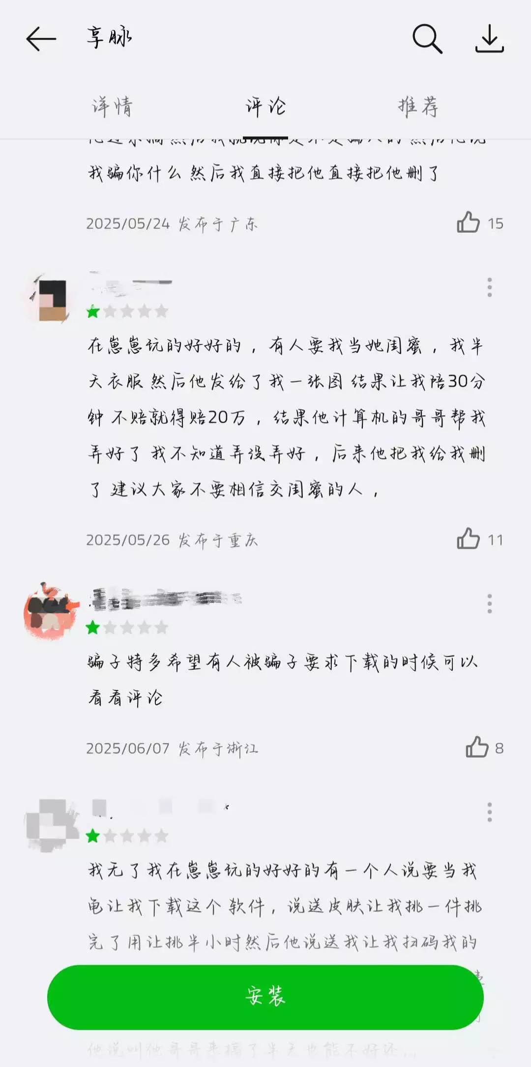 上面的图片是软件下面的评论,还有一个是我遇到的诈骗人员