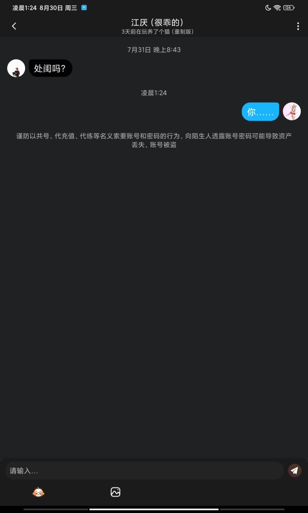 家人们真是无语今天在玩的时候看到了一个姐妹,没有人陪她玩于是我跟他玩,玩了一会儿之后,我看到聊天区里有人商量打boss的时候,那时候我才意识到光顾着打怪了,没有打boss于是我就发了一个,完了boss还没有打后面什么的都记不起来了,因为是好几小时前才玩的我只记得他们大吵了一顿,然后我准备录个屏结果他不让我录屏就算了不过他还骂我生气了就退了