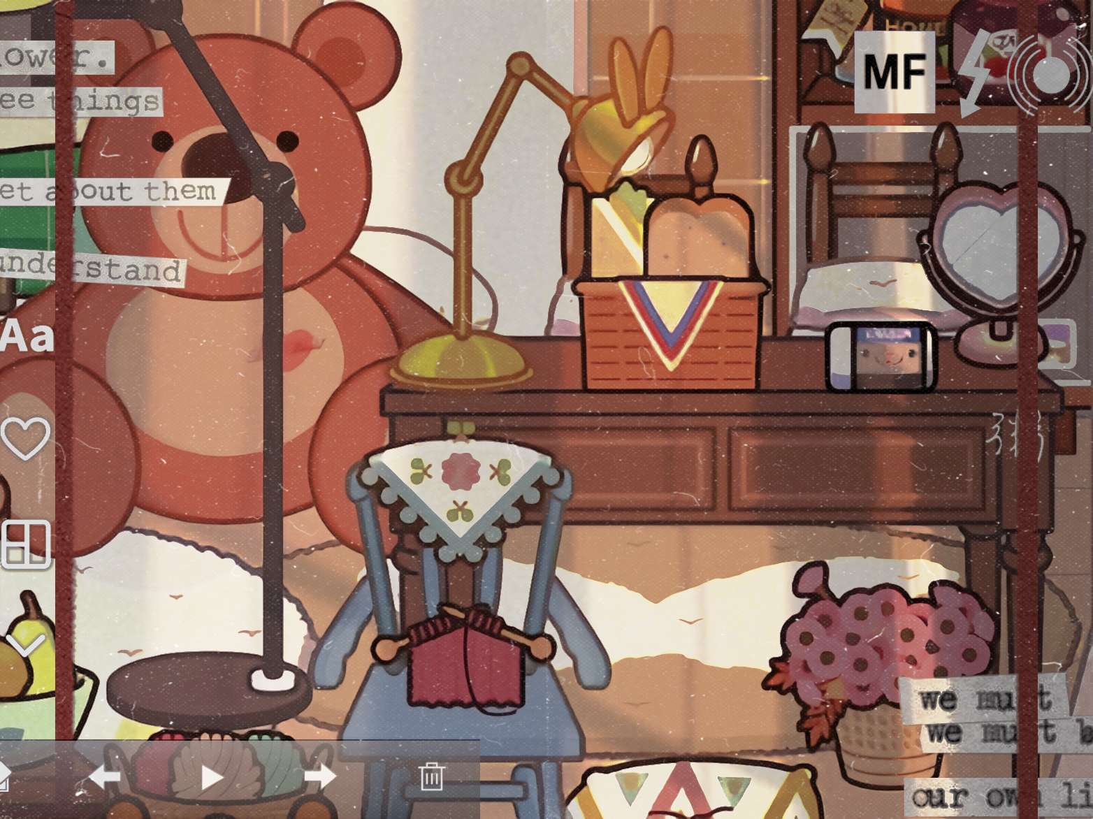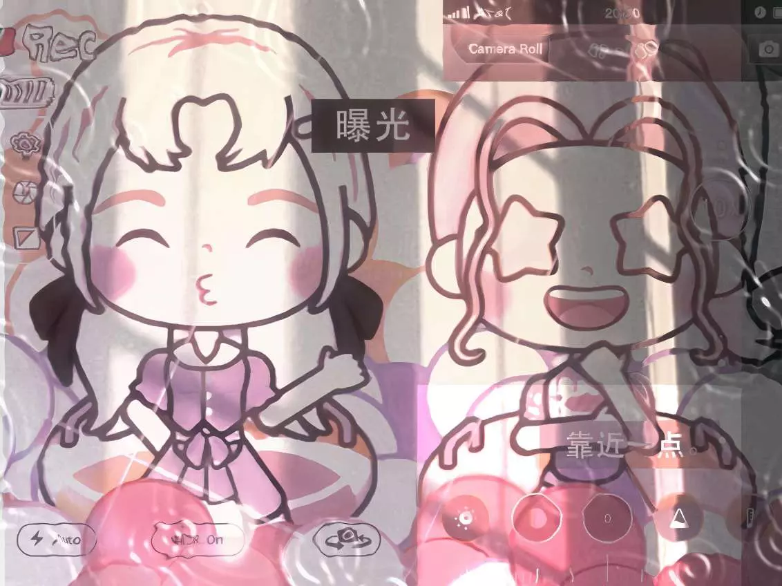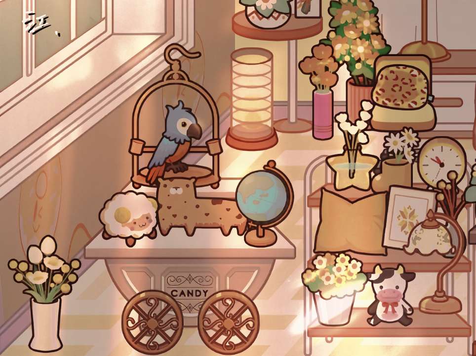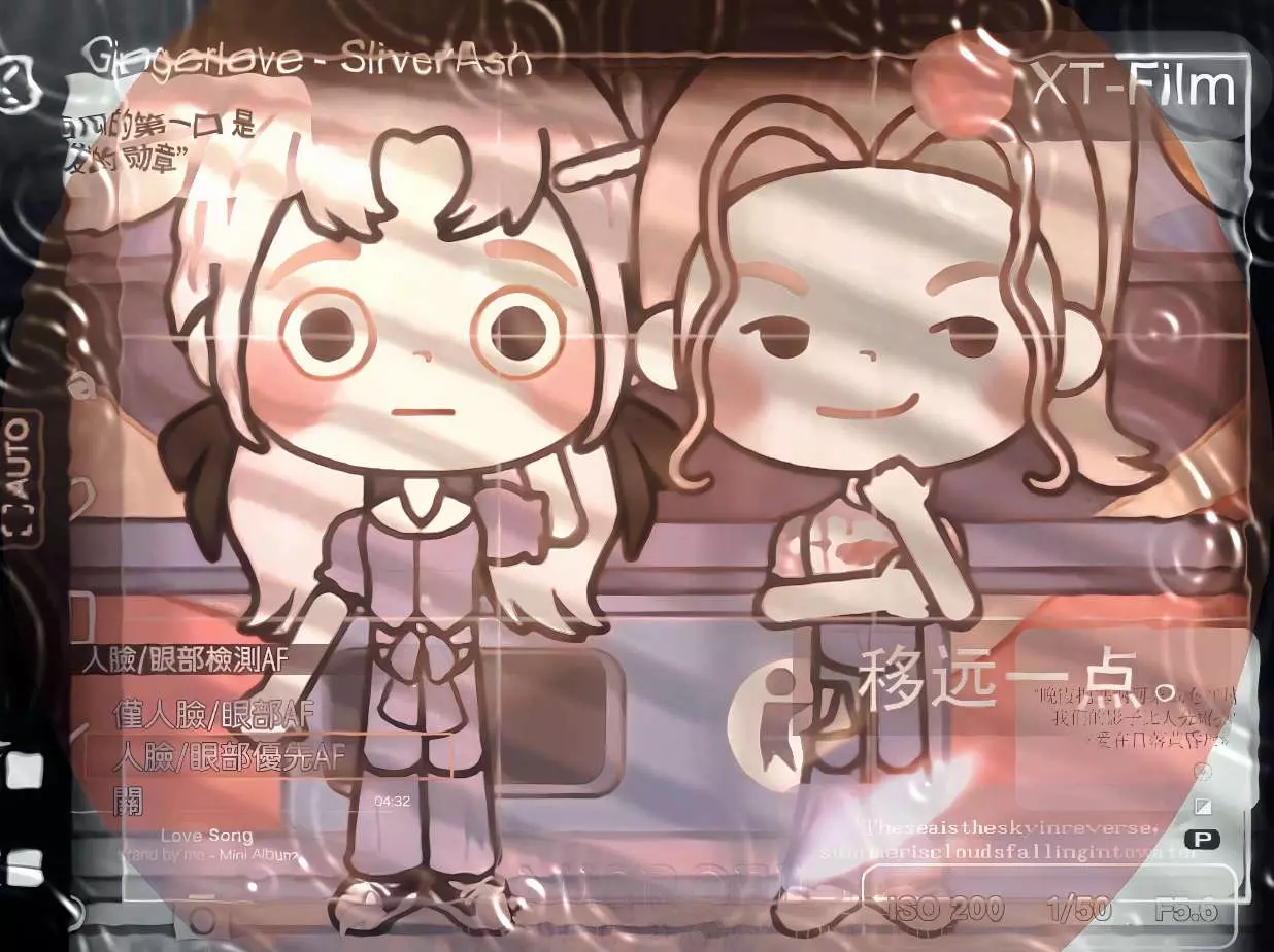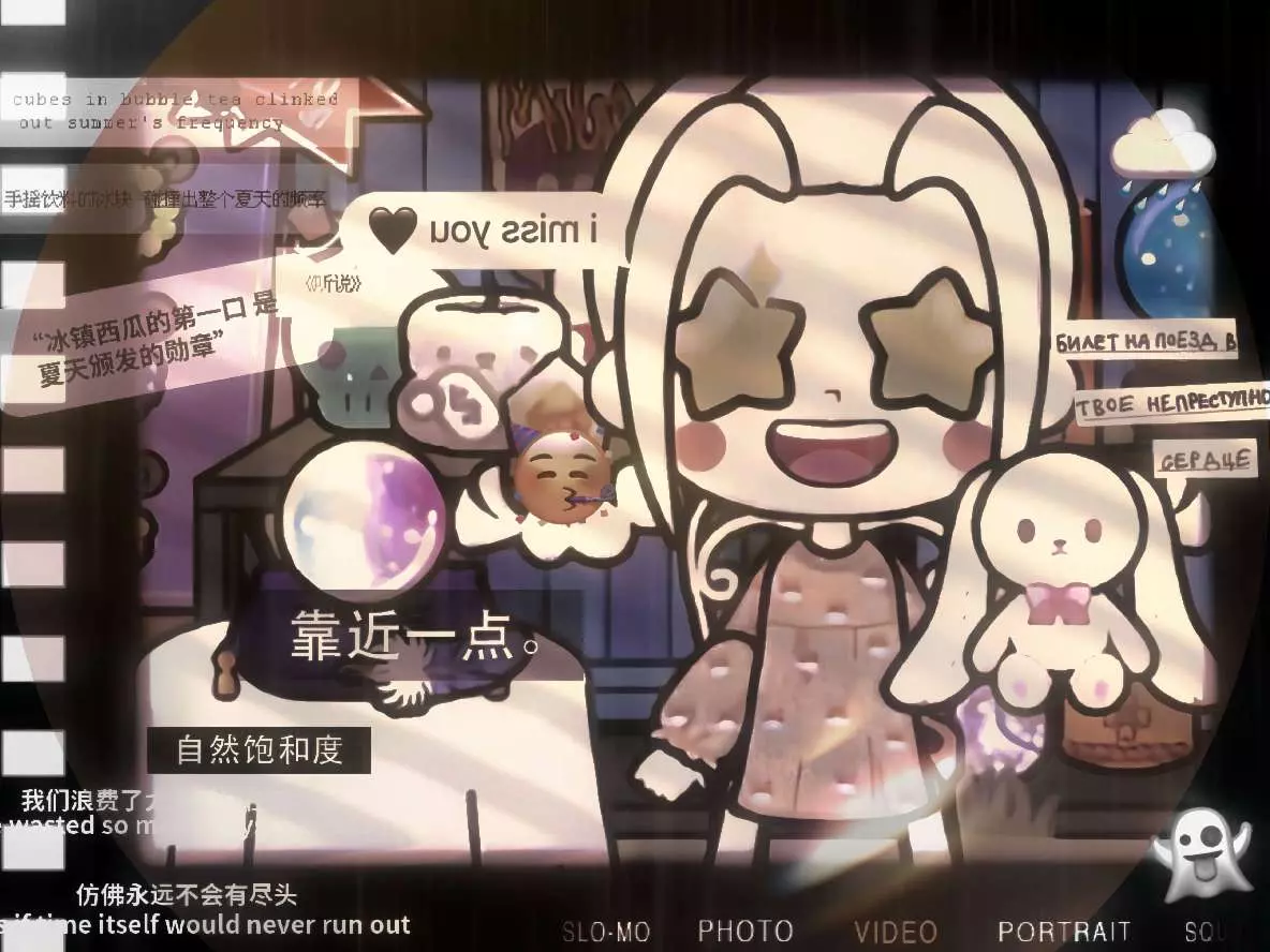 江江正静坐在明镜之前,置身于一个奇幻的世界。镜中映出的江江,与往常一样,却又因周遭的景致而显得格外不同。镜子旁,几朵彩色的云悠然自得地飘浮着,它们像是天空中的精灵,误入了这静谧的室内空间。这些云朵主要以紫色和粉色为主,形成了如此和谐美妙的画面。它们轻轻摇曳,似乎在低语,为这平凡的瞬间增添了一抹不可言喻的魔力。