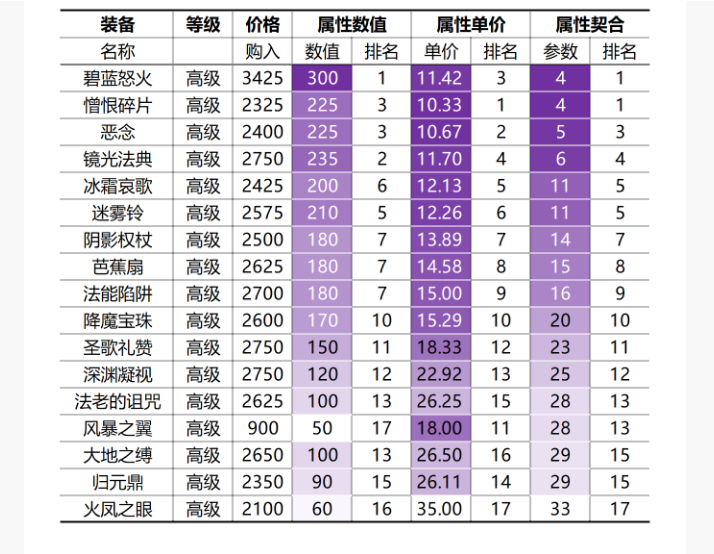 嗨喽!大家好🌷 我是熙熙!众所周知,曙光英雄是一款5v5公平竞技游戏,游戏中有多个拥有独特技能的英雄可以选择,配合经典的MOBA游戏玩法,非常受玩家欢迎,游戏中英雄的选择和装备搭配是很多玩家关注的问题,尤其是对新手玩家来说,选择一些好上手的英雄更加重要,熙熙在这里整理了多个[新手英雄攻略],快来看看吧!———————————————————————截至2024年S2赛季,共有99件装备,包括55件高级装备,25件中级装备和19件低级装备。装备的特征包括等级、分类、价格(购入价格和售出价格)、属性、技能(唯一被动和唯一主动)和合成途径。1 装备属性同名装备属性可以叠加,没有装备提供法术穿透属性,装备属性共有14项,包括◆2种攻击(物理攻击/物攻,28件,红色字体标记;法术攻击/法攻,24件,紫色字体标记)◆1种穿透(物理穿透/物穿,3件)◆2种防御(物理防御/物防,16件;法术防御/法防,17件)◆2种生命(最大生命/生命,26件,绿色字体标记;每5秒回血/回血,2件)◆2种法力(最大法力/法力,8件;每5秒回蓝/回蓝,4件)。其他5项属性分别为◆生命汲取/汲取,4件 ◆攻击速度/攻速,10件 ◆暴击率/暴击,8件 ◆移动速度移速,17件 ◆技能急速/急速,31件1.1 物理攻击◆装备数量:19件高级装备、6件中级装备和3件低级装备。◆装备极值:物理攻击理论叠加上限为6件【平衡支配者】,110×6=660,共需2950×6=17700金币。低级装备中,物理攻击最高和最低的装备分别是30的【军用手斧】和10的【简易手弩】,性价比最高和最低的装备分别是18.75的【简易手弩】和50.00的【深红袖箭】;中级装备中,物理攻击最高和最低的装备分别是50的【巨人之弓】和20的【灾祸】,性价比最高和最低的装备分别是17.50的【巨人之弓】和43.00的【虹光】;高级装备中,物理攻击最高和最低的装备分别是110的【平衡支配者】和30的【蔷薇箭袋】,性价比最高和最低的装备分别是26.82的【平衡支配者】和81.67的【蔷薇箭袋】。1.2 法术攻击◆装备数量:17件高级装备、5件中级装备和3件低级装备。◆装备极值:低级装备中,法术攻击最高和最低的装备分别是85的【聚能宝珠】和50的【橡木魔杖】,性价比最高和最低的装备分别是7.00的【橡木魔杖】和12.00的【聚能宝珠】;中级装备中,法术攻击最高和最低的装备分别是130的【巫师之刺】和50的【鹰眼之石】,性价比最高和最低的装备分别是6.35的【巫师之刺】和15.00的【鹰眼之石】;高级装备中,法术攻击最高和最低的装备分别是300的【碧蓝怒火】和50的【风暴之翼】,性价比最高和最低的装备分别是10.33的【憎恨碎片】和60.00的【火凤之眼】。1.3 物理穿透◆装备数量:3件高级装备,没有初级和中级装备提供物理穿透属性。◆装备极值:高级装备中,物理穿透最高和最低的装备分别是30的【牛魔的咆哮】和20的【不朽之王】/【掠影迅刃】,性价比最高和最低的装备分别是86.70的【牛魔的咆哮】和125.00的【掠影迅刃】。1.4 物理防御◆装备数量:10件高级装备、4件中级装备和2件低级装备。◆装备极值:低级装备中,物理防御最高和最低的装备分别是25的【小圆盾】和12的【心灵之石】,性价比最高和最低的装备分别是13.00的【小圆盾】和29.17的【心灵之石】;中级装备中,物理防御最高和最低的装备分别是50的【锯齿方盾】和35的【愤怒之盾】/【皇家盾牌】,性价比最高和最低的装备分别是17.00的【锯齿方盾】和25.00的【军团披风】;高级装备中,物理防御最高和最低的装备分别是130的【荆棘刺盾】和40的【钢铁之翼】/【群星之耀】,性价比最高和最低的装备分别是18.85的【荆棘刺盾】和52.50的【群星之耀】。1.1.5 法术防御◆装备数量:11件高级装备、4件中级装备和2件低级装备。◆装备极值:低级装备中,法术防御最高和最低的装备分别是35的【勇气臂环】和12的【心灵之石】,性价比最高和最低的装备分别是9.29的【小圆盾】和29.17的【心灵之石】;中级装备中,法术防御最高和最低的装备分别是75的【贤者之手】和2的【掠影迅刃】,性价比最高和最低的装备分别是8.33的【贤者之手】和25.00的【军团披风】;高级装备中,物理防御最高和最低的装备分别是115的【崇高信念】和45的【霜燃】,性价比最高和最低的装备分别是13.75的【守护之翼】和60.00的【霜燃】。———————————————————————okok本期内容到此结束(因为帖子发不出去)希望给大家带来一点小帮助若有不恰当的地方,请大家多多指教🌷🌷
