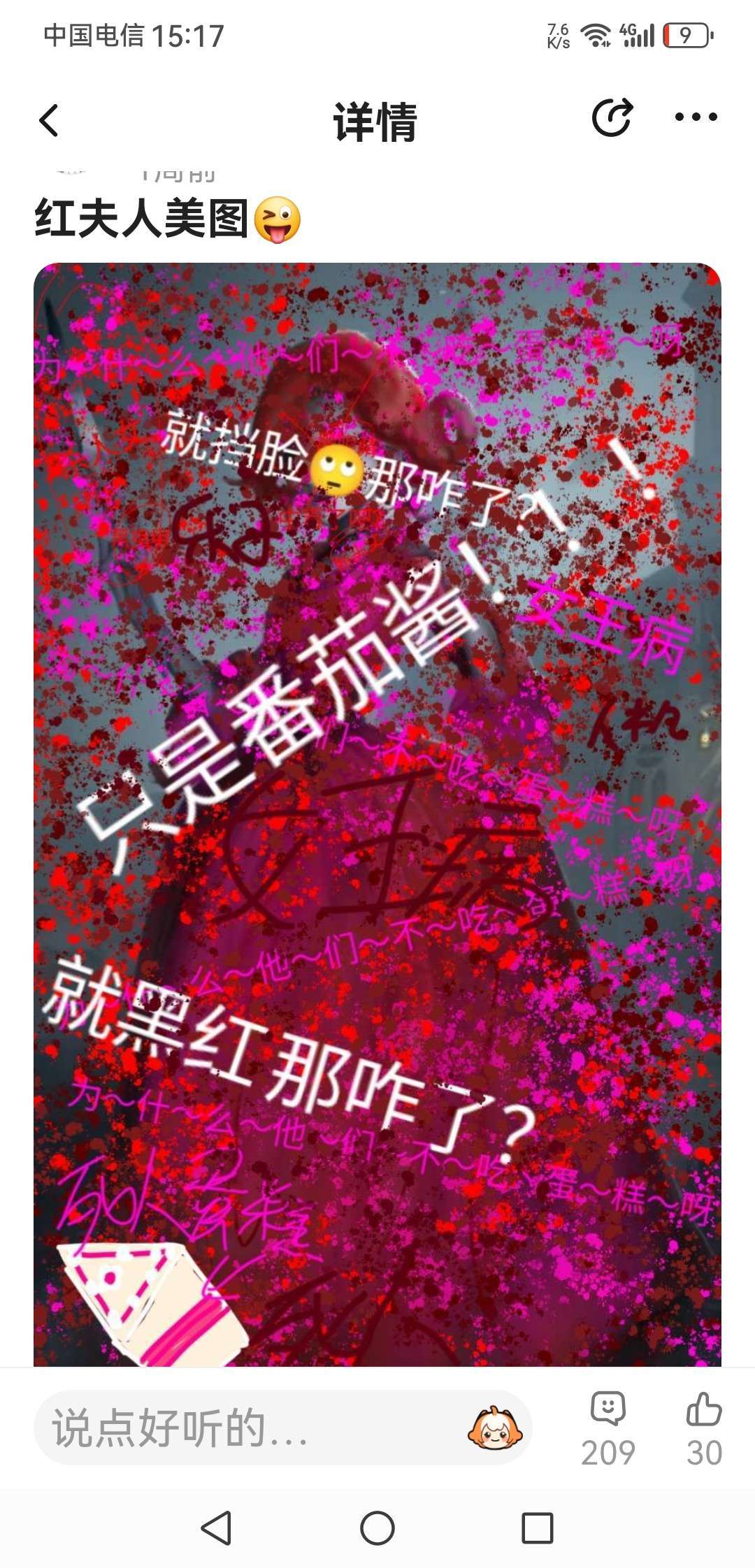 这个人恶心死了,首先我们玩的是的是护眼队,这人是监管,然后打打我们之后,就一直放血,鞭尺,因为我们自起都交了,然后赛后没截屏,恶心死了,还仗着是小号,封了无所谓。