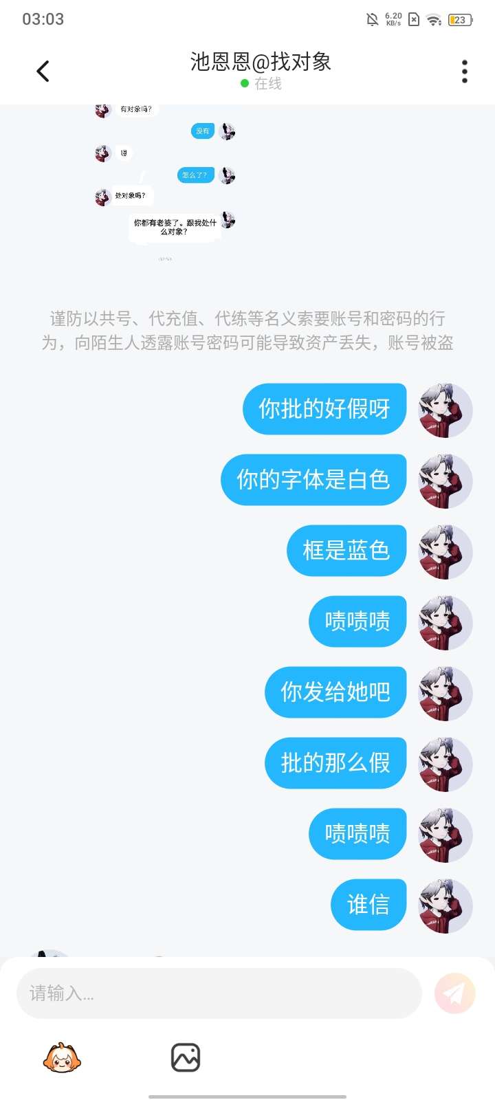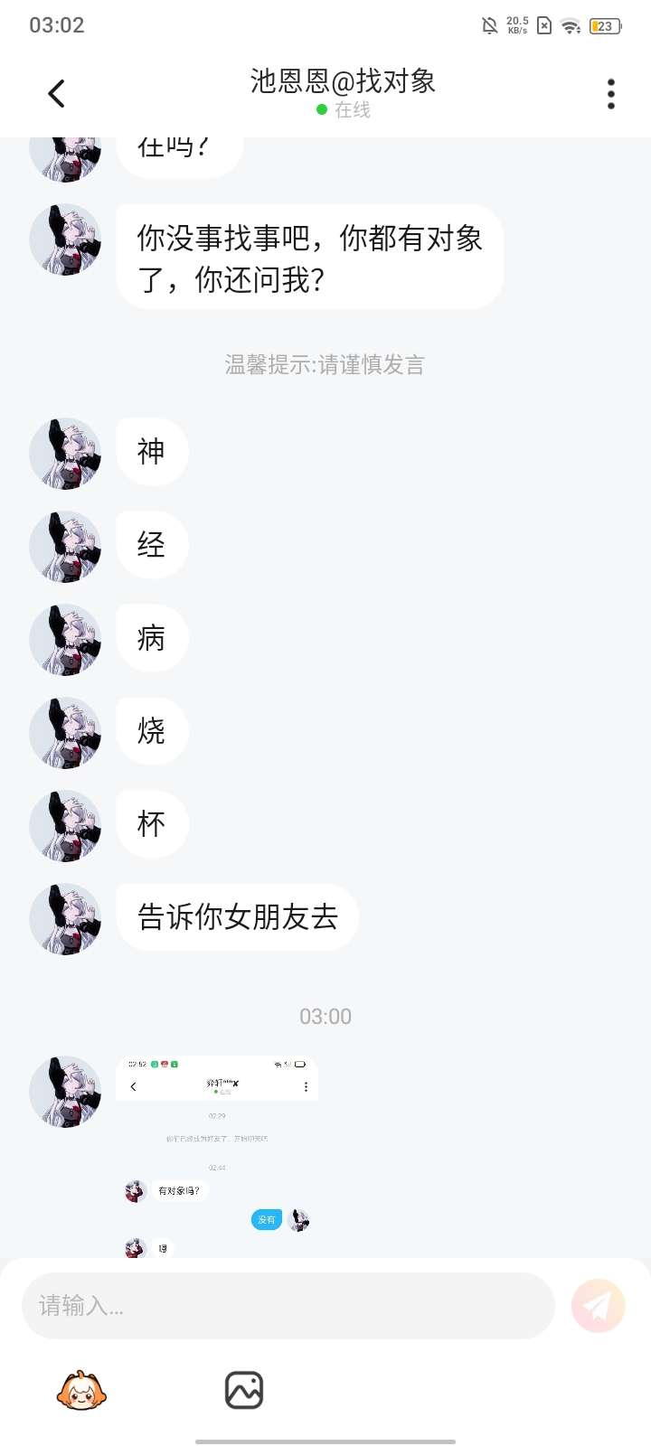 遇到一个自恋狂批图,批的死假还把批的图给我威胁我和我对象关系。还骂我,我一直没有骂她哦,只能说,小姐姐你清高,没有对象,批图来凑。最后一个她批的图