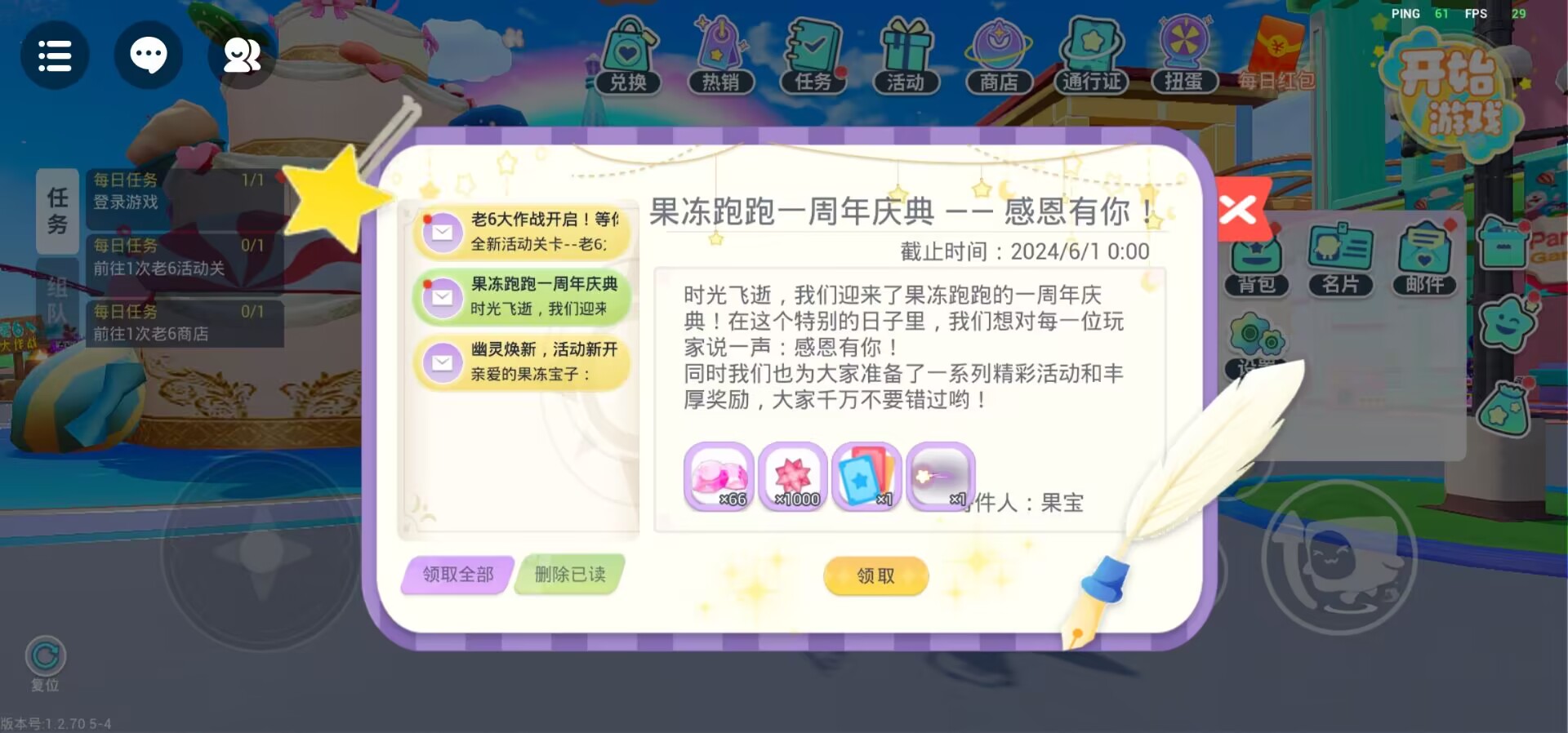 周年庆奖励包含XXXXXXXX,将通过游戏内邮件系统发放,邮件将在游戏更新后发布,请各位果冻宝子注意查收!