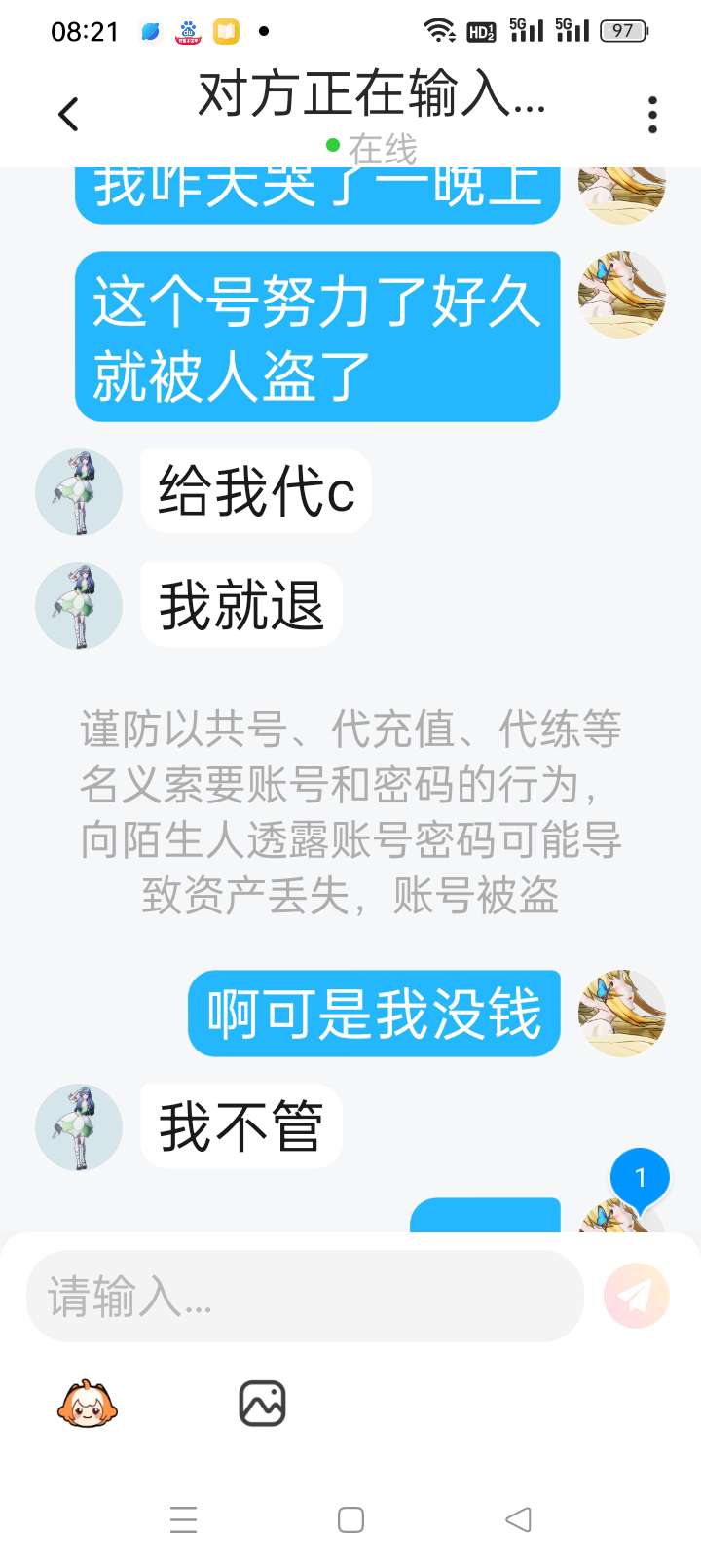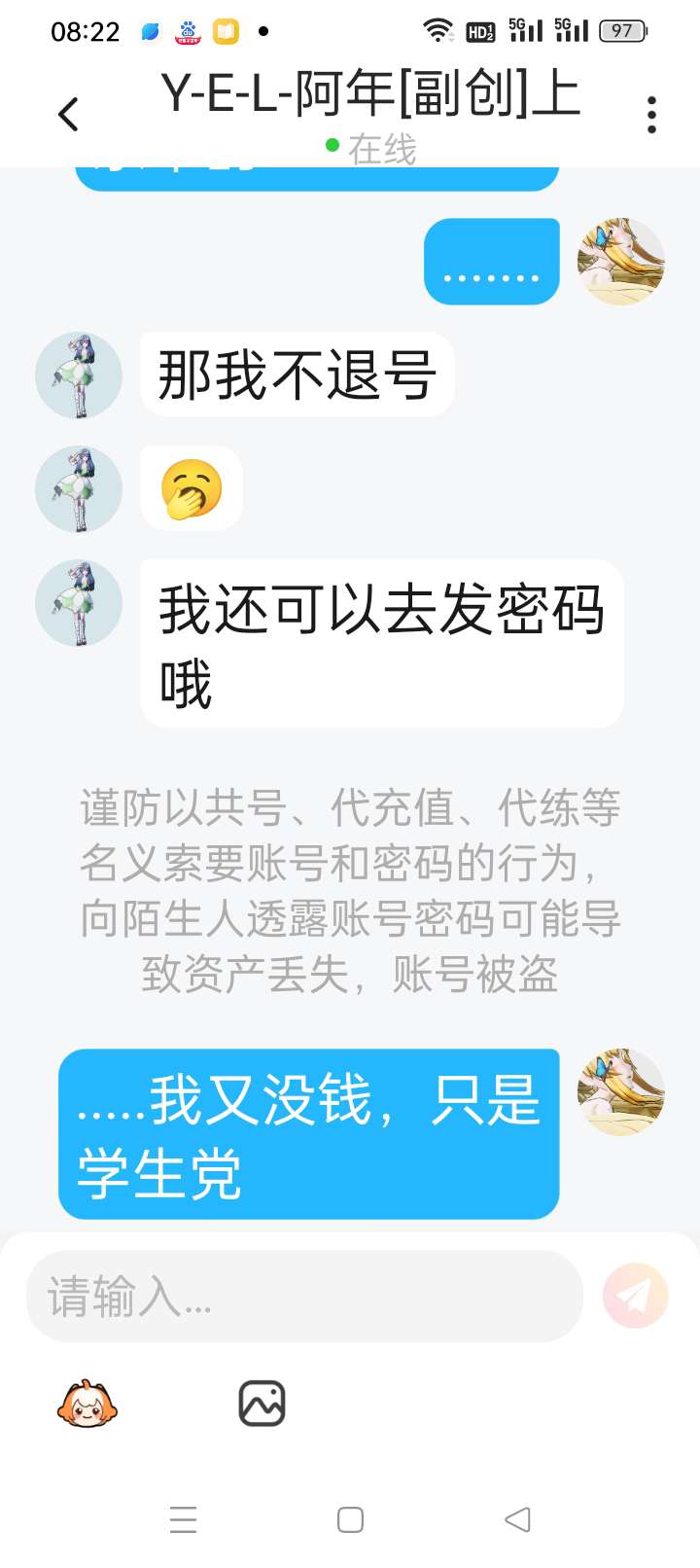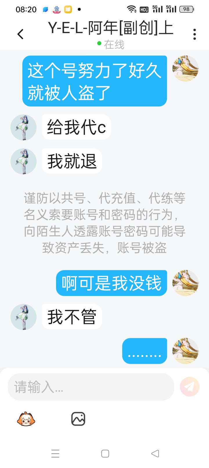 首先我是申请你福利,我相信你才把密码给了你,结果呢?你刀我号,很光荣是吗?还P图说是我刀你小号?请问不是你刀我号吗?还在那儿狡辩呢?你演技真好,还把我闺迷惑了,请问一下你是有b吗?好爱装啊,我都佩服你了,不举报都觉得对不起我了,还跟我说要dc呢.