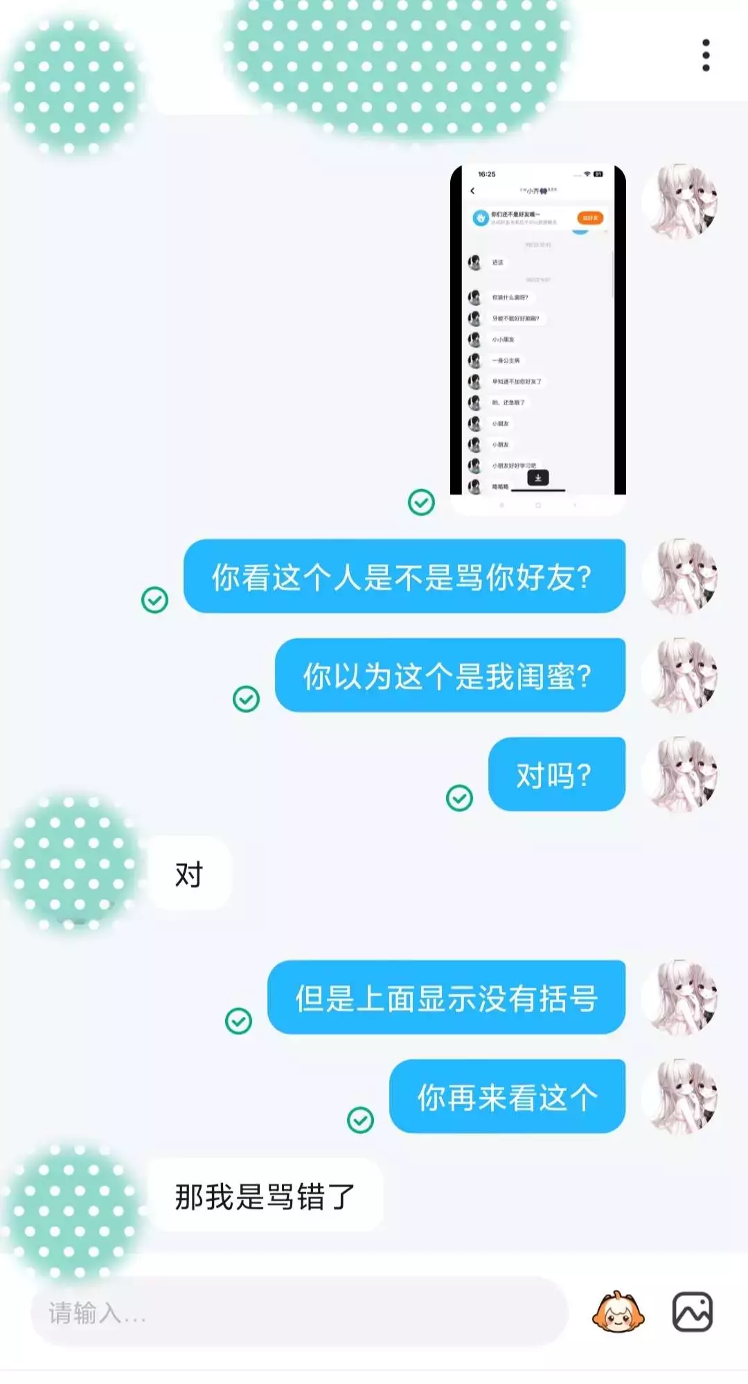 不是,这个人有点儿极品美人哈,这个人本来是我闺蜜,然后呢她就是被骂了,然后我就替她出头,然后呢最后原来是误会,我给她发了图片,结果她就说我背叛了她,不是大姐,我怎么就背叛你了,前一张我先给她说一下吧,我不能直接就开骂她吧,万一她把我拉黑了,我不就那啥了吗?