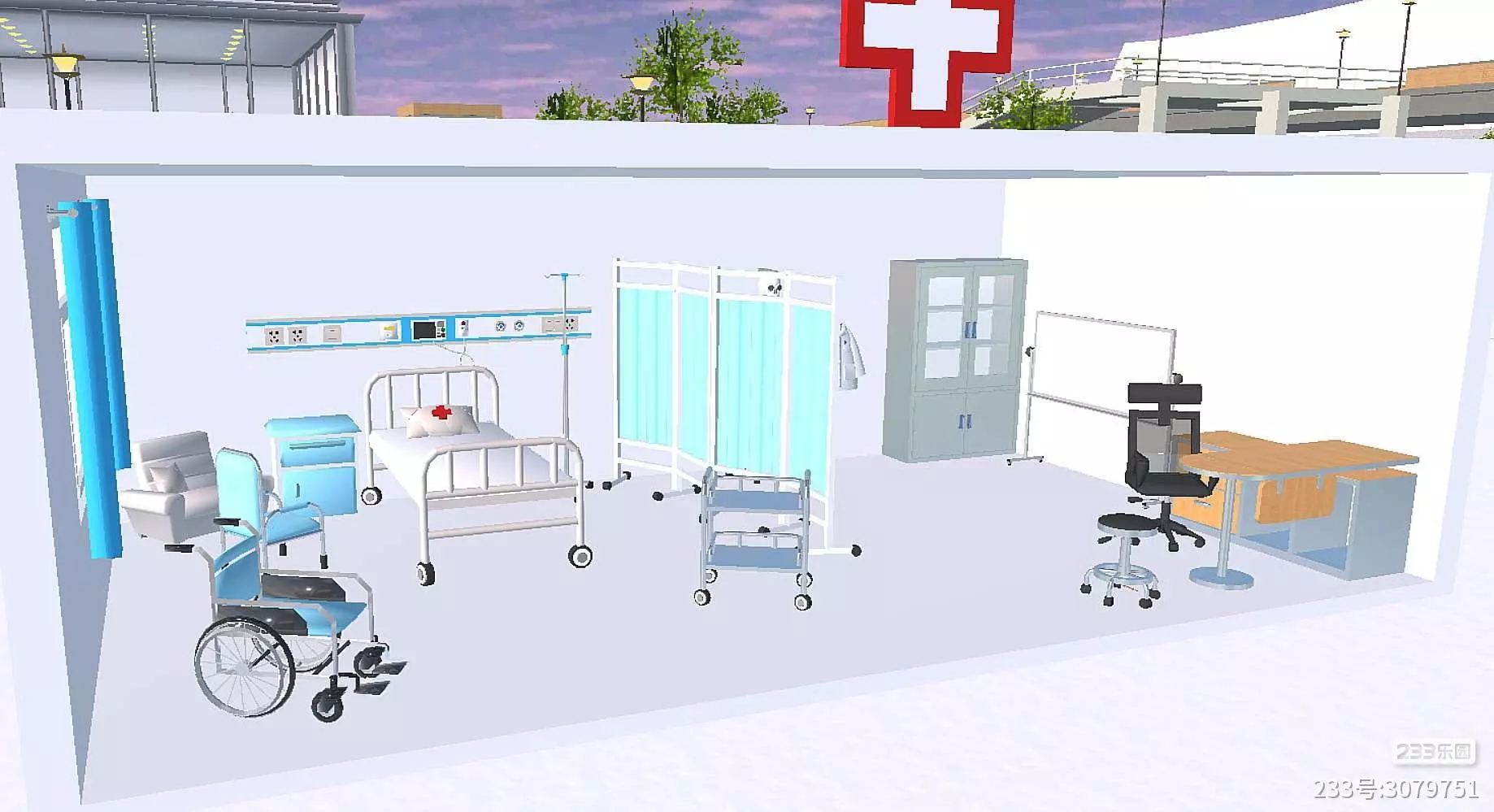 🎊元素➕主要🈶,病床🛏️,医疗箱🧰,轮椅🦽,针管💉,药💊,创可贴🩹,听诊器,救护车🚑,电脑🖥️,打印机🖨️,医疗本📋,小刀🔪,血迹❣️,计温器🌡️,还有人骨展示架,人体模型摆件,也是我最满意的两个部分,可惜小道具有限,腋杖🩼没能融入跑酷当中