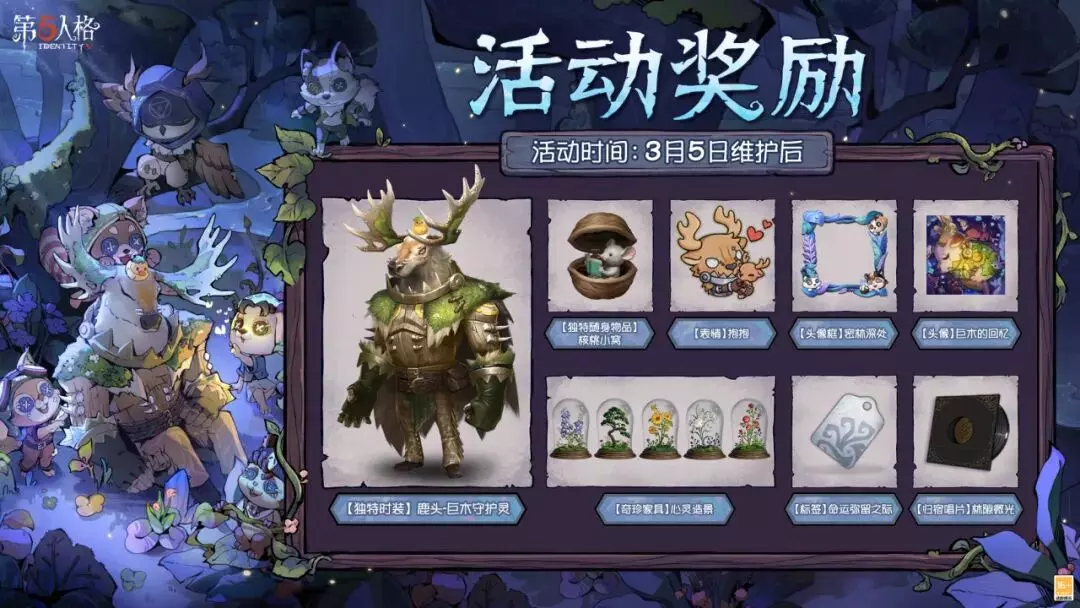 “再会,巨木林”主题活动将于3月5日维护后开启,访客们参与活动即可获取【独特时装】鹿头-巨木守护灵、【奇珍家具】心灵造景等丰厚奖励~