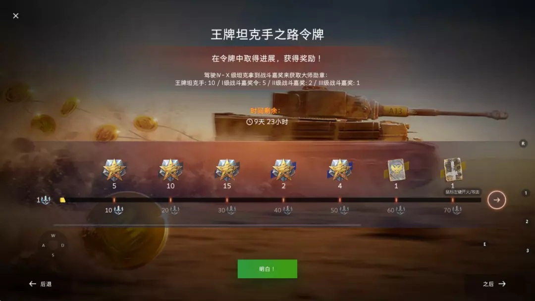 2月27日至3月9日,登录游戏即可激活王牌坦克手之路令牌,驾驶VII-X级坦克,拿到战斗嘉奖令可获取大师勋章,其可兑换: