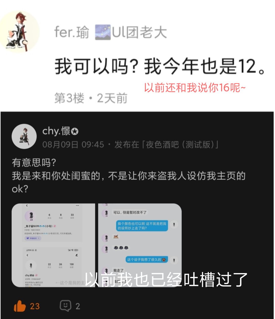 我在主页说过,盗设开专场。所以来啦 这位还是我前闺,以前已经吐槽过了 人设 主页 名字 样样不差