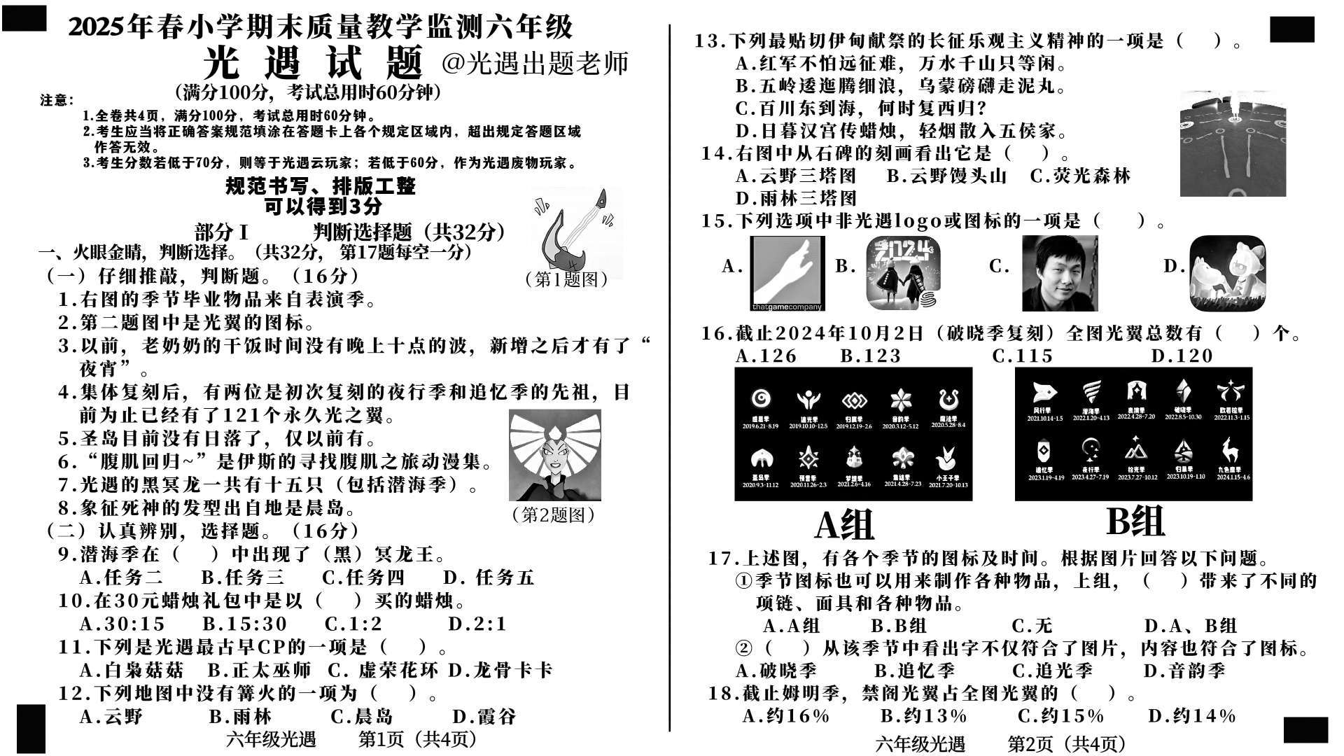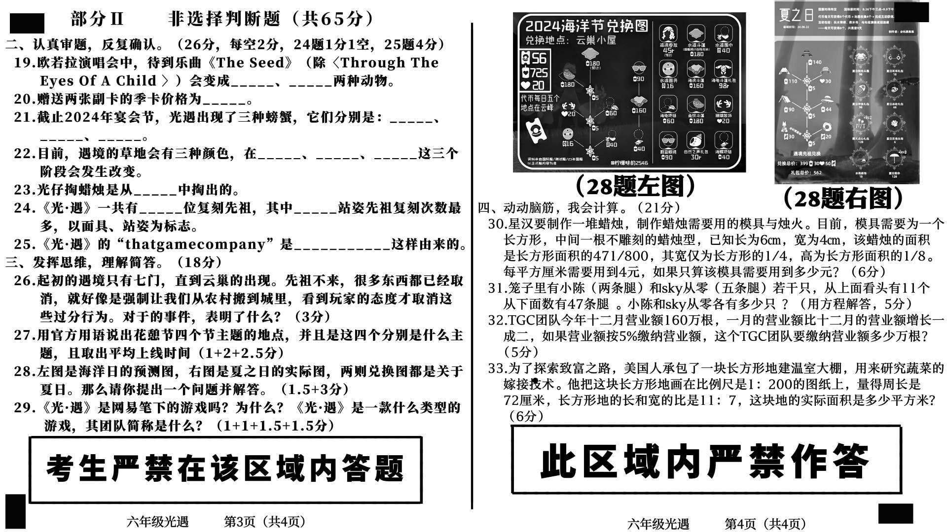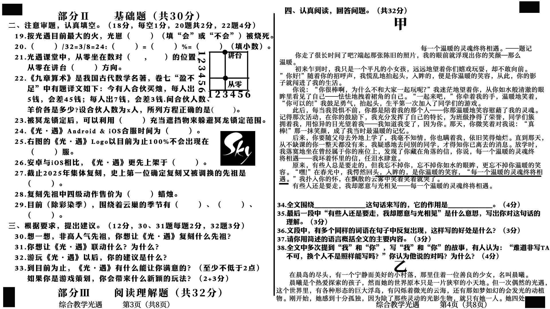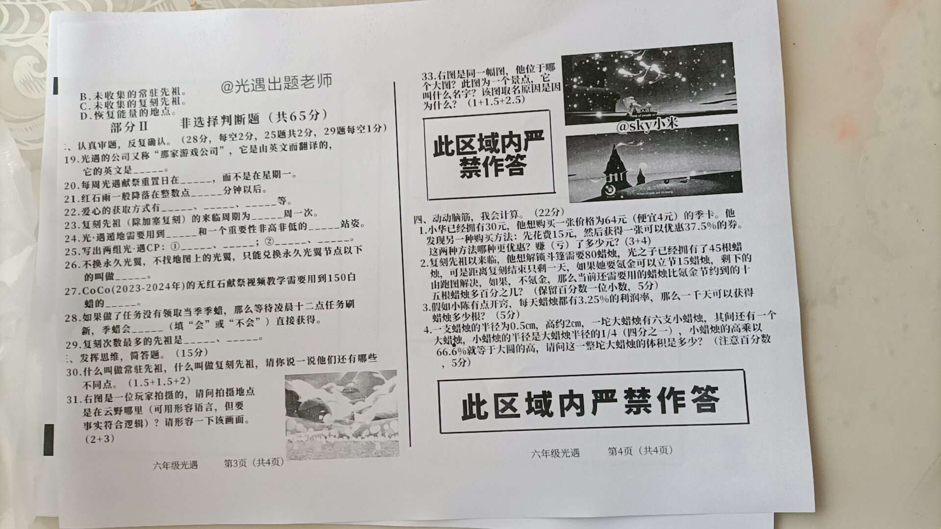 光遇期末试卷,自己出的,要的找我原图给你
