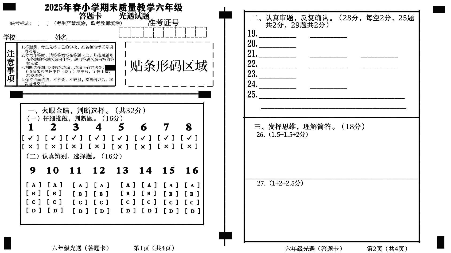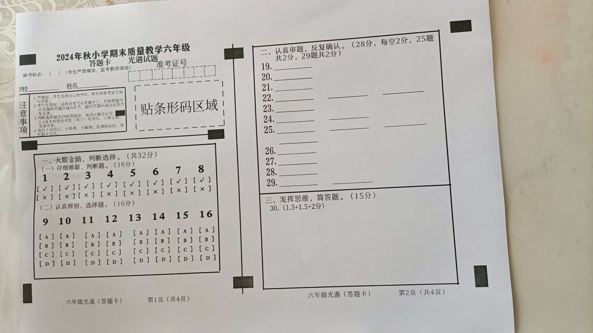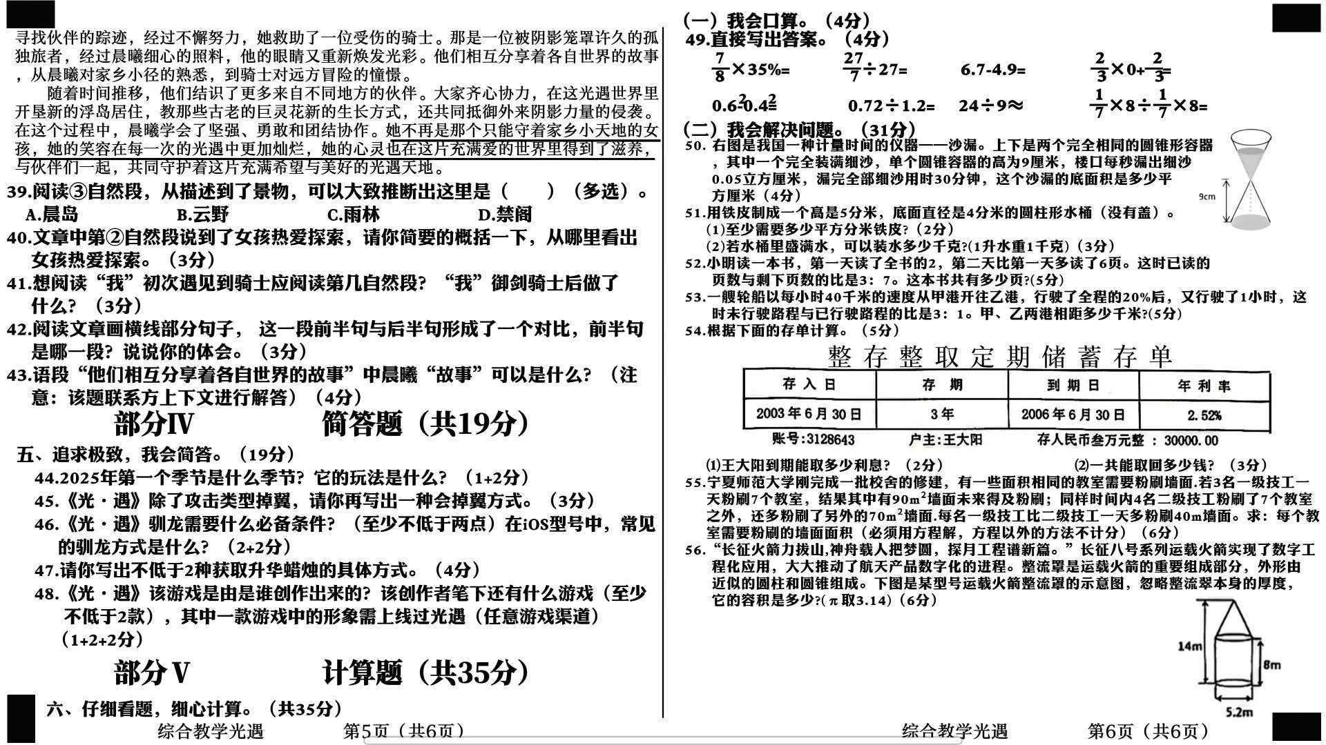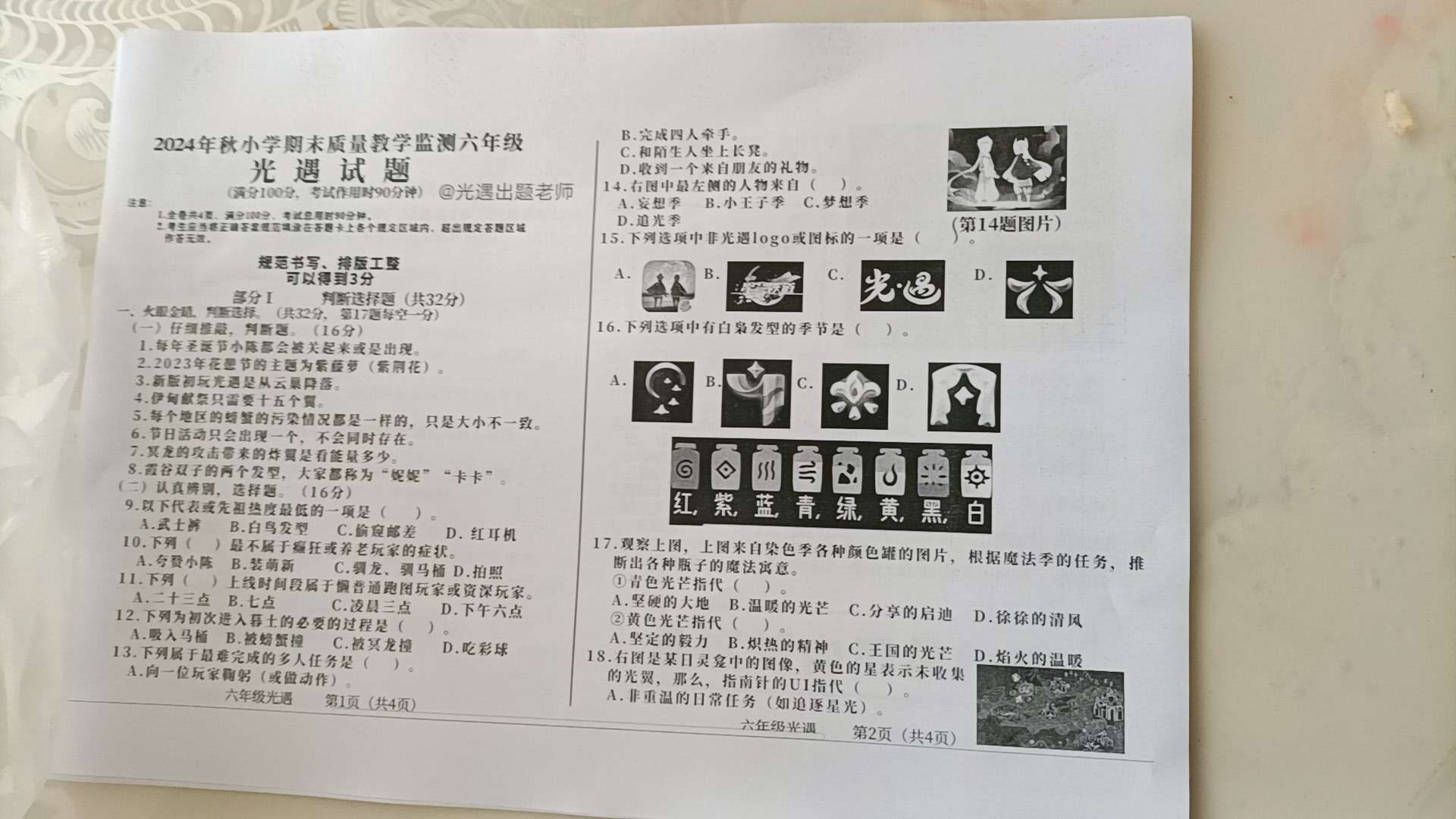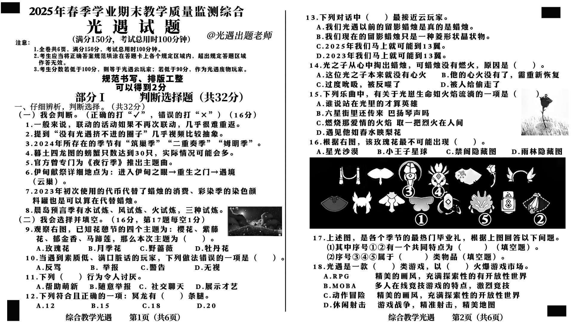 光遇期末试卷,自己出的,要的找我原图给你