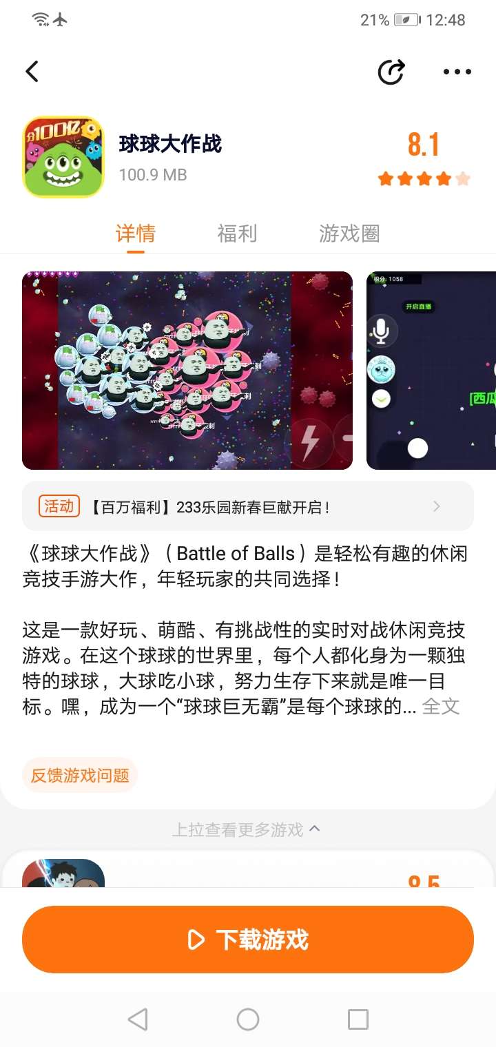 《球球大作战》(Battle of Balls)是轻松有趣的休闲竞技手游大作,年轻玩家的共同选择! 这是一款好玩、萌酷、有挑战性的实时对战休闲竞技游戏。在这个球球的世界里,每个人都化身为一颗独特的球球,大球吃小球,努力生存下来就是唯一目标。嘿,成为一个“球球巨无霸”是每个球球的梦想呢! 【游戏玩法】 1.大球吃小球是这个世界的真理! 2.变大变胖是这个世界民众的梦想! 3.只要合理控制球球的运动路径就可以吃掉沿路的小球球,变大变胖变强! 4.小球不要沮丧,飞毛腿的你,只要不停的吃,终有一天你也会成为无敌的胖纸呢! 5.大球也不要轻心,身为胖纸的你,横行霸道的时候千万小心暗器噢~ 更新说明: 12月1日《球球大作战》【极寒大逃杀】赛季将正式开启!赛季专属逃杀玩法再次升级,追加全新内容,更有海量福利在这寒冬暖心相赠!在这最冷的日子里,六小只将恒久温暖送给你!