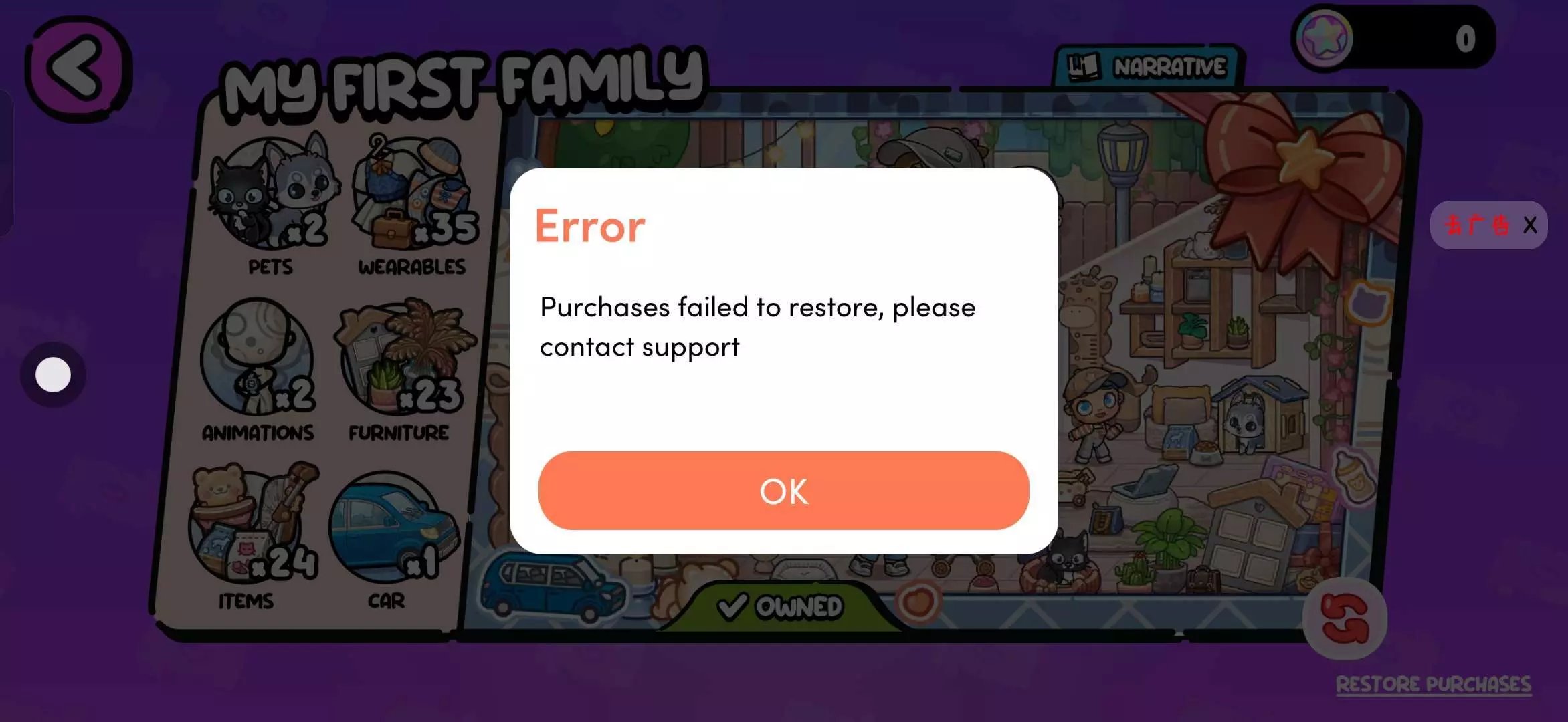 尝试点击“RESTORE PURCHASES”恢复购买时,游戏弹出错误提示:“Purchases failed to restore, please contact support”。
