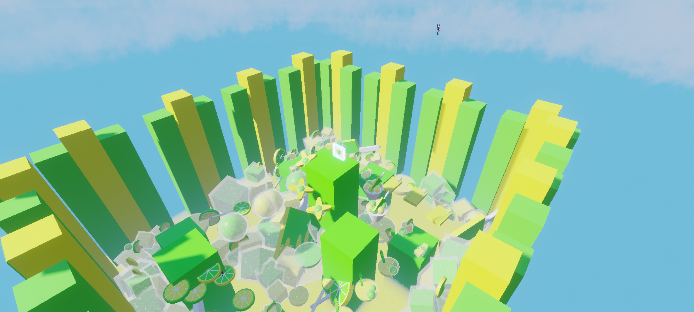 1.关卡:一共有八关,全部都是充满青柠味的关卡。①青柠棒棒糖:两棵青柠味的棒棒糖,踩着棒棒糖来到了第二关。②方块:二个黄色方块加一个绿色方块组成,外面包裹着透明的材质。显着更加清新。③黄绿方块:黄色偏方块中夹着两条绿色方块,左上具有正方体方块做装点。④青柠饮料:黄色半圆方块,绿色大小不一的球,全用透明材质包裹着,还有青柠片做点缀,建议加个吸管。⑤青柠片:脚下踩着青柠片一步步走向高处。⑥球:绿色和黄色的圆球。⑦青柠冰激凌:白色碗里装着冰激凌。⑧三个圆形方块压偏,中间镶嵌着球。(★★★☆☆)