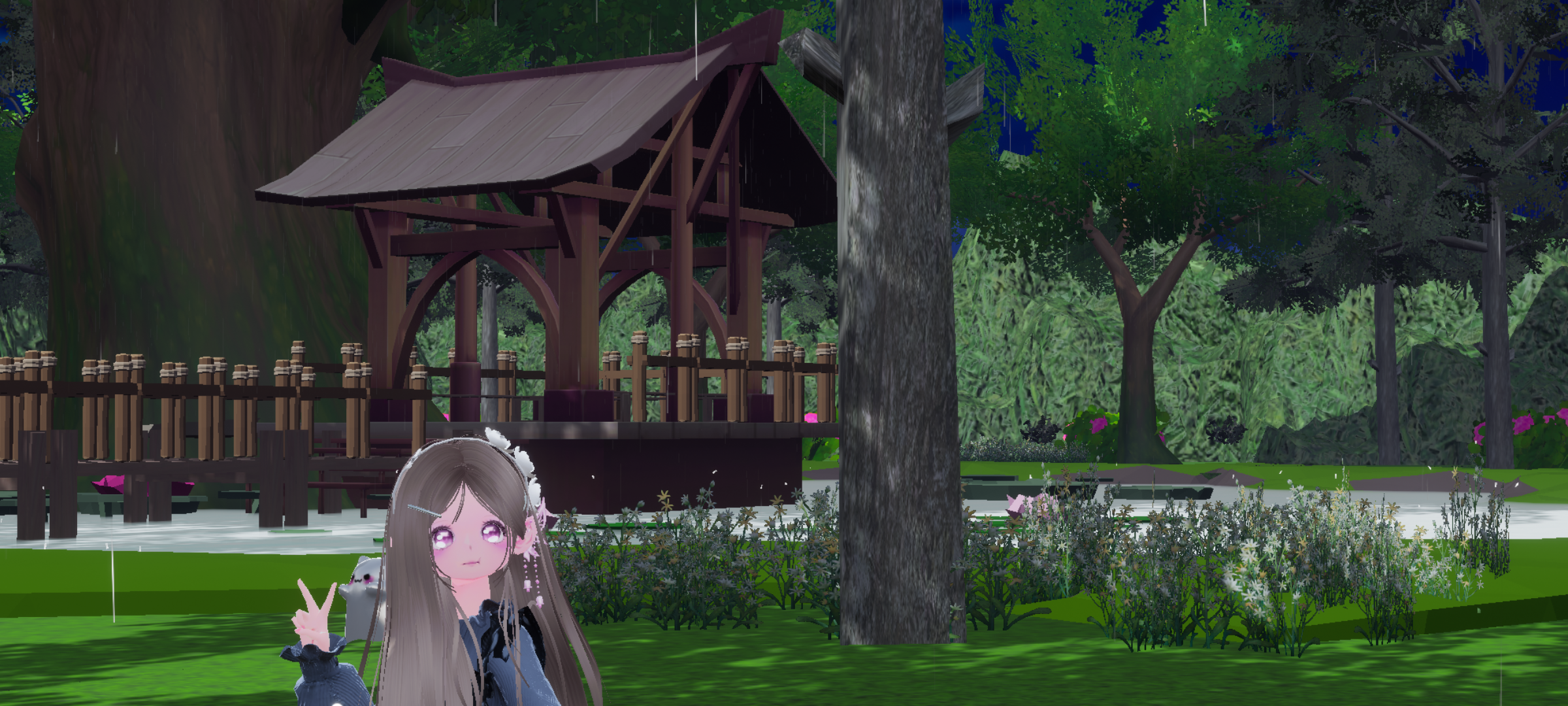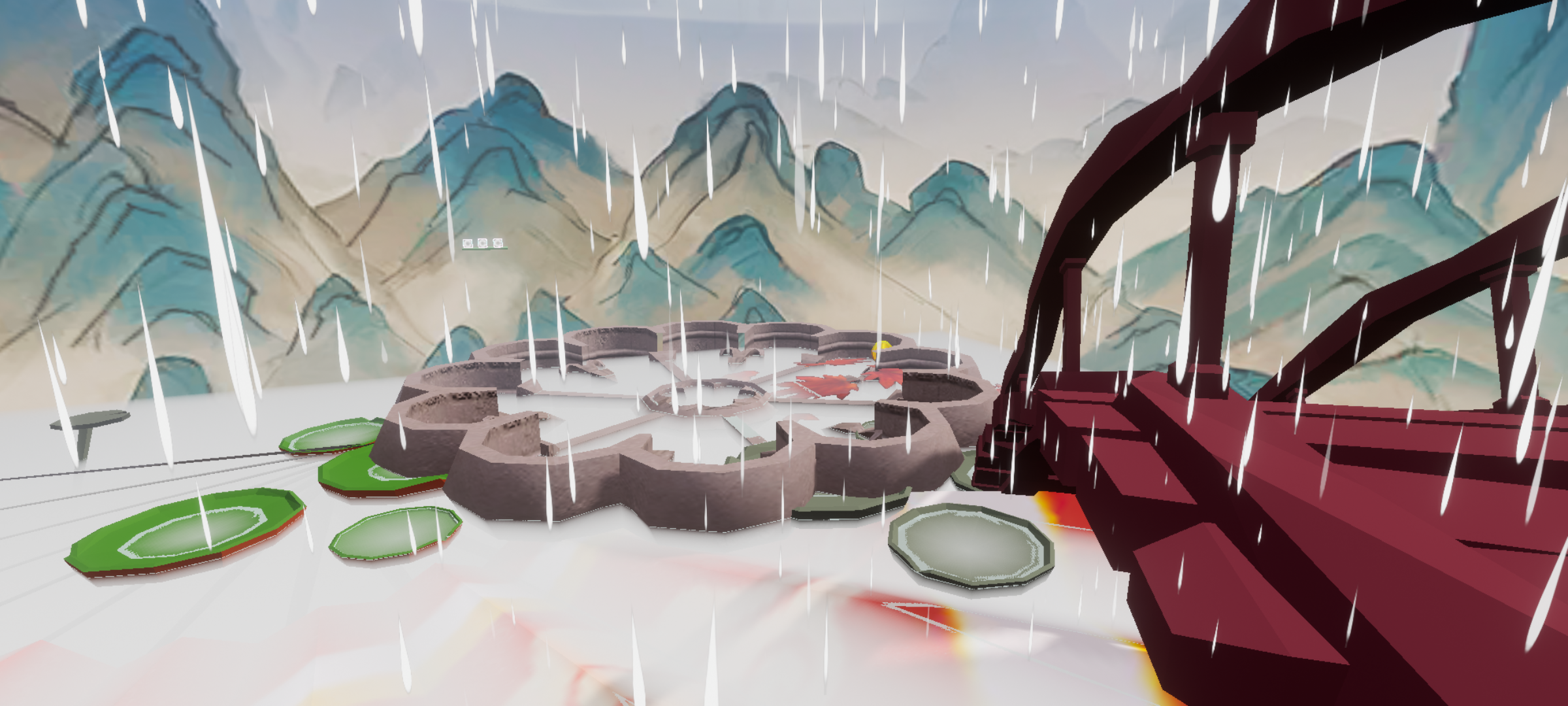 图中下着蒙蒙细雨,为整个图又增添了一份美景,三个传送门,分别前往园林区,观赏区,跑酷区 。