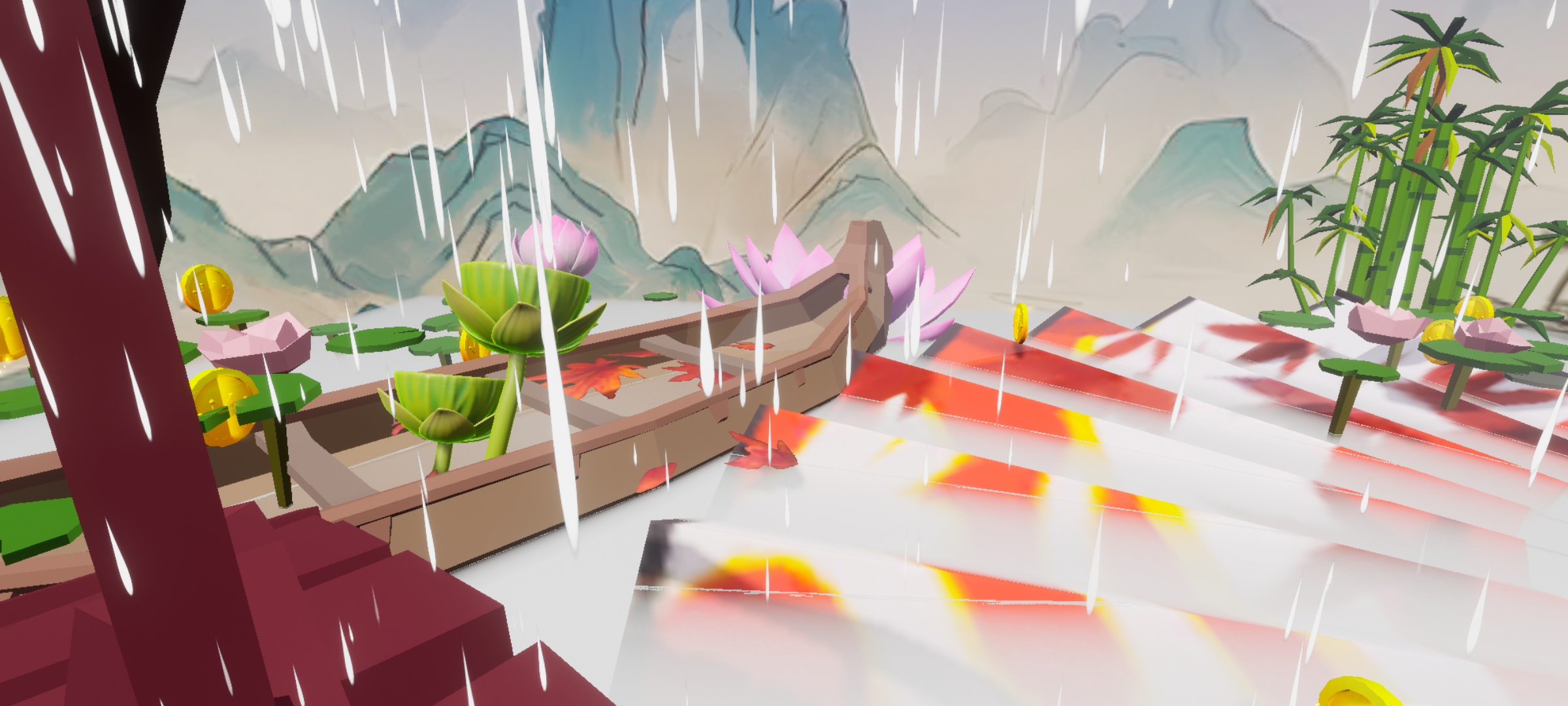 2.画面:“花韵竹开”整个地图与这个名字无比贴合。淅淅沥沥的小雨、远处画般的高山、周围的竹子、高处的鹤、水墨画风格,诗中的画面,使人隐居在此处的想法。