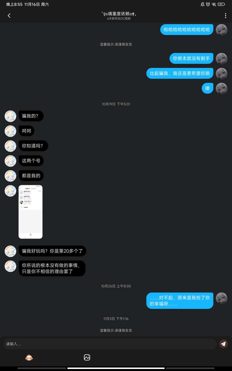 你们知道吗?他演了好多次了,他纯真的骗了我好久,我没生气,他到这演上了,我怀疑他脑袋里有大饼
