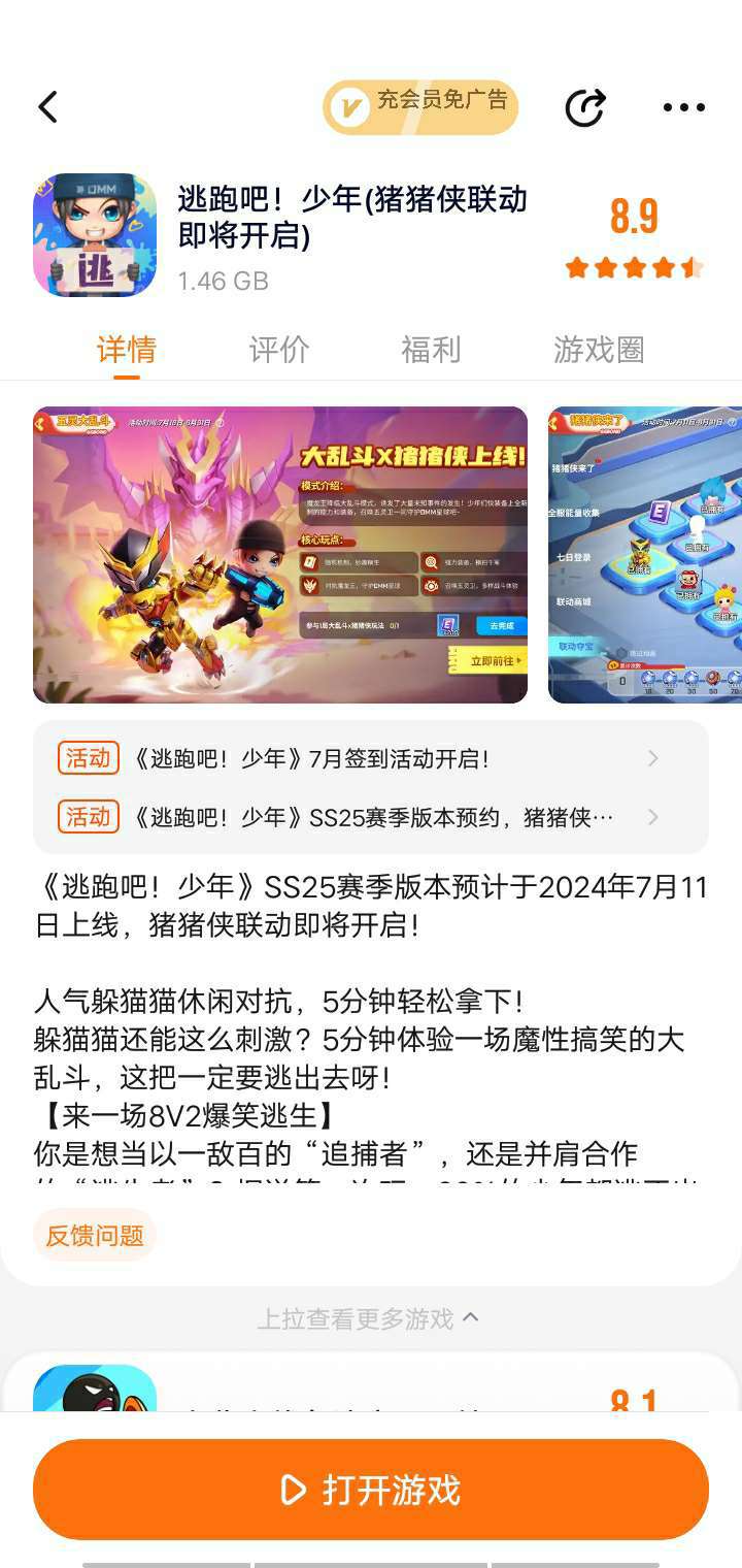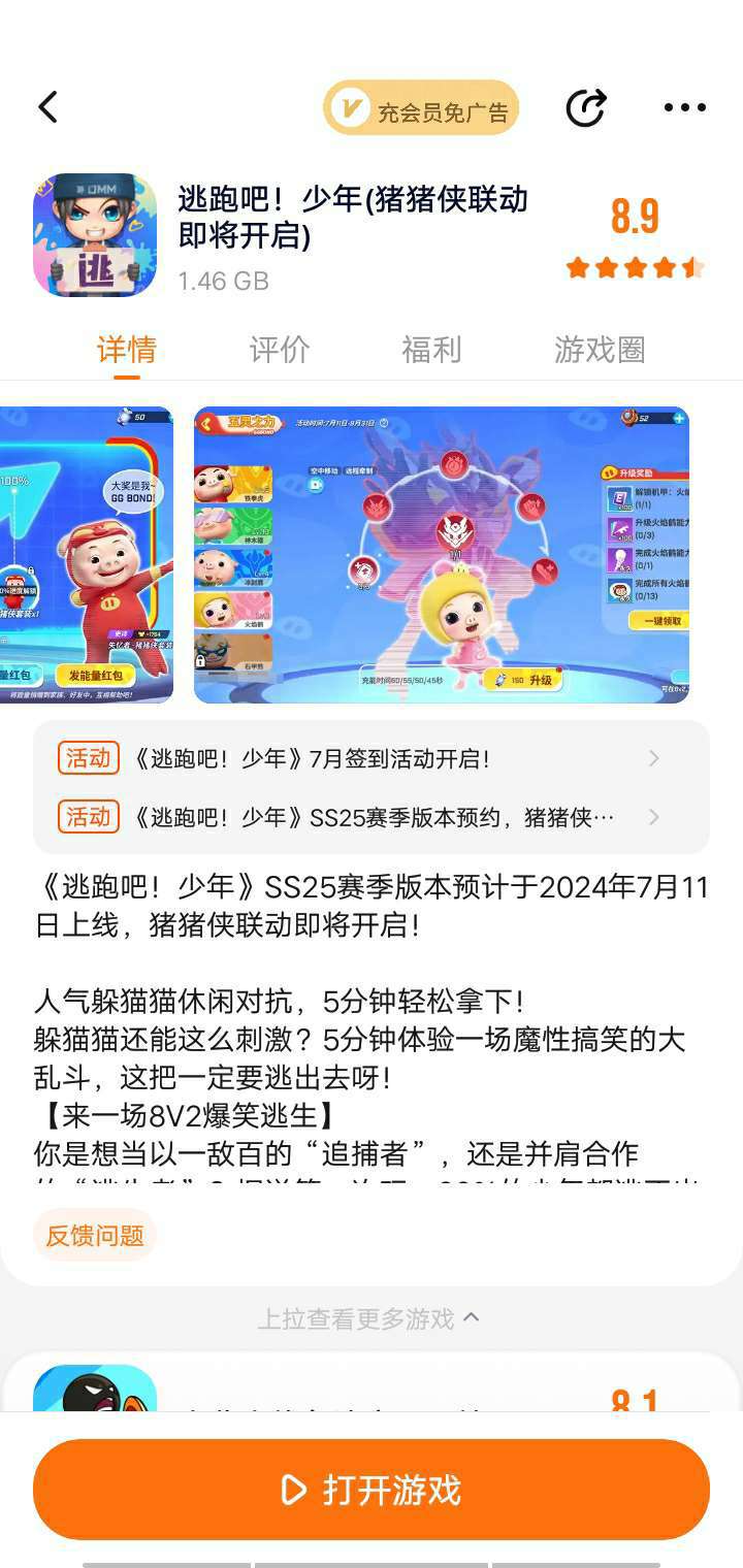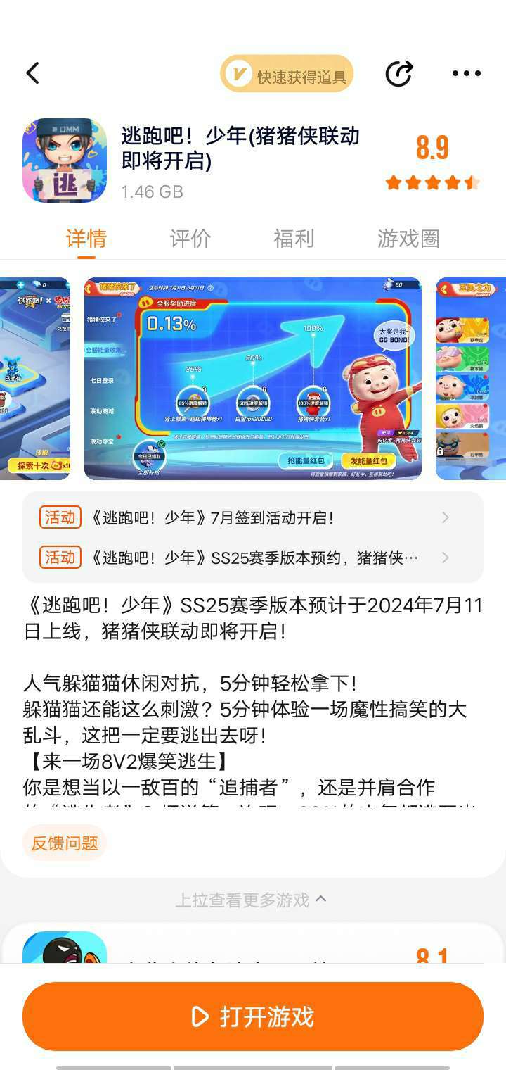 《逃跑吧!少年》SS25赛季版本预计于2024年7月11日上线,猪猪侠联动即将开启! 人气躲猫猫休闲对抗,5分钟轻松拿下! 躲猫猫还能这么刺激?5分钟体验一场魔性搞笑的大乱斗,这把一定要逃出去呀! 【来一场8V2爆笑逃生】 你是想当以一敌百的“追捕者”,还是并肩合作的“逃生者”?据说第一次玩,99%的少年都逃不出去!除了成功出逃,组团暴捶“追捕者”,体验也是棒棒哒。 【看!花里胡哨的道具】 菠萝捶人,大葱回血,滑板还能追跑车!各种脑洞大开的道具组合、奇葩刺激的对抗姿势等你来解锁。江湖上流传着一句话:“学物理,上逃跑,牛顿能被你气倒。” 【5分钟极速大乱斗】 5分钟能做什么?遇事不决玩逃跑!组队体验超刺激乱斗,真大神都能5分钟解决战斗、秀翻全场。少年快上车! 【各路人才在线恶搞】 大头萝莉、无情特工……有的角色看起来可可爱爱,打起人来谁都不爱。也有看起来一本正经,但总躲草丛阴你的大坏蛋!被打倒的猛男追捕,竟然靠“卖萌求饶”的表情包逃过一劫。