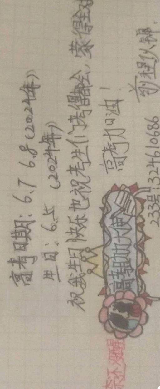 内容:花里面的是两个毕业的女孩,她们穿着晚礼服。高考助力大使的名称右边有两张纸和一支笔。头衔上面是个皇冠,代表着快乐!(边框是橙色的飘带和红色的锦旗)