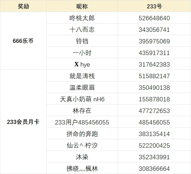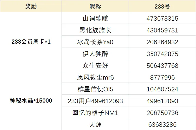 所有正确参与活动②的玩家中,随机抽取10名玩家送出233会员月卡1张