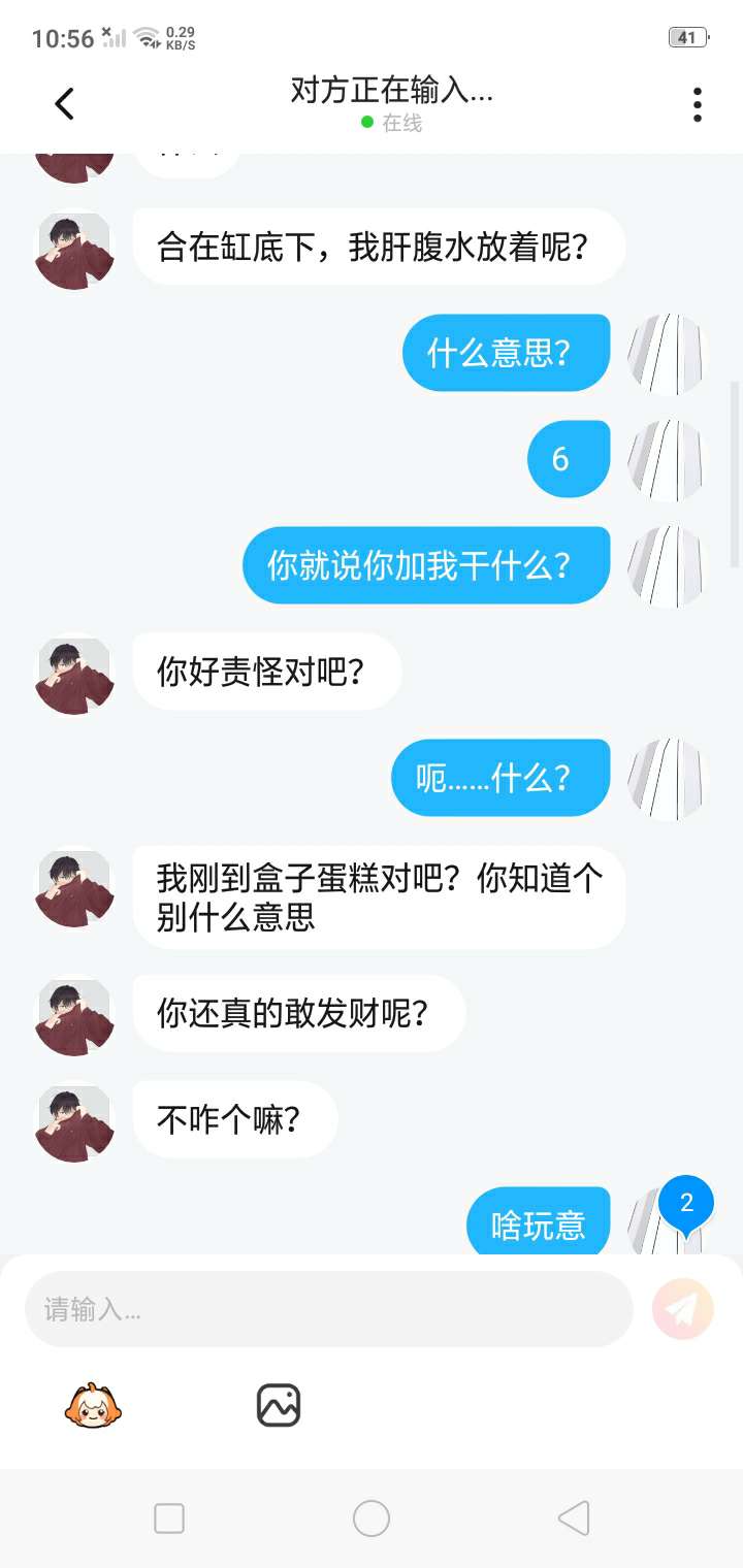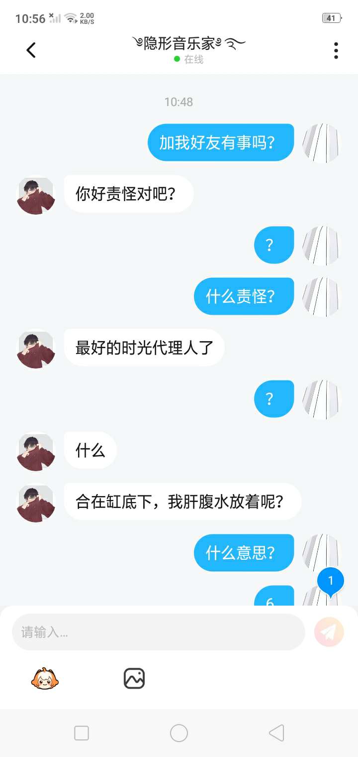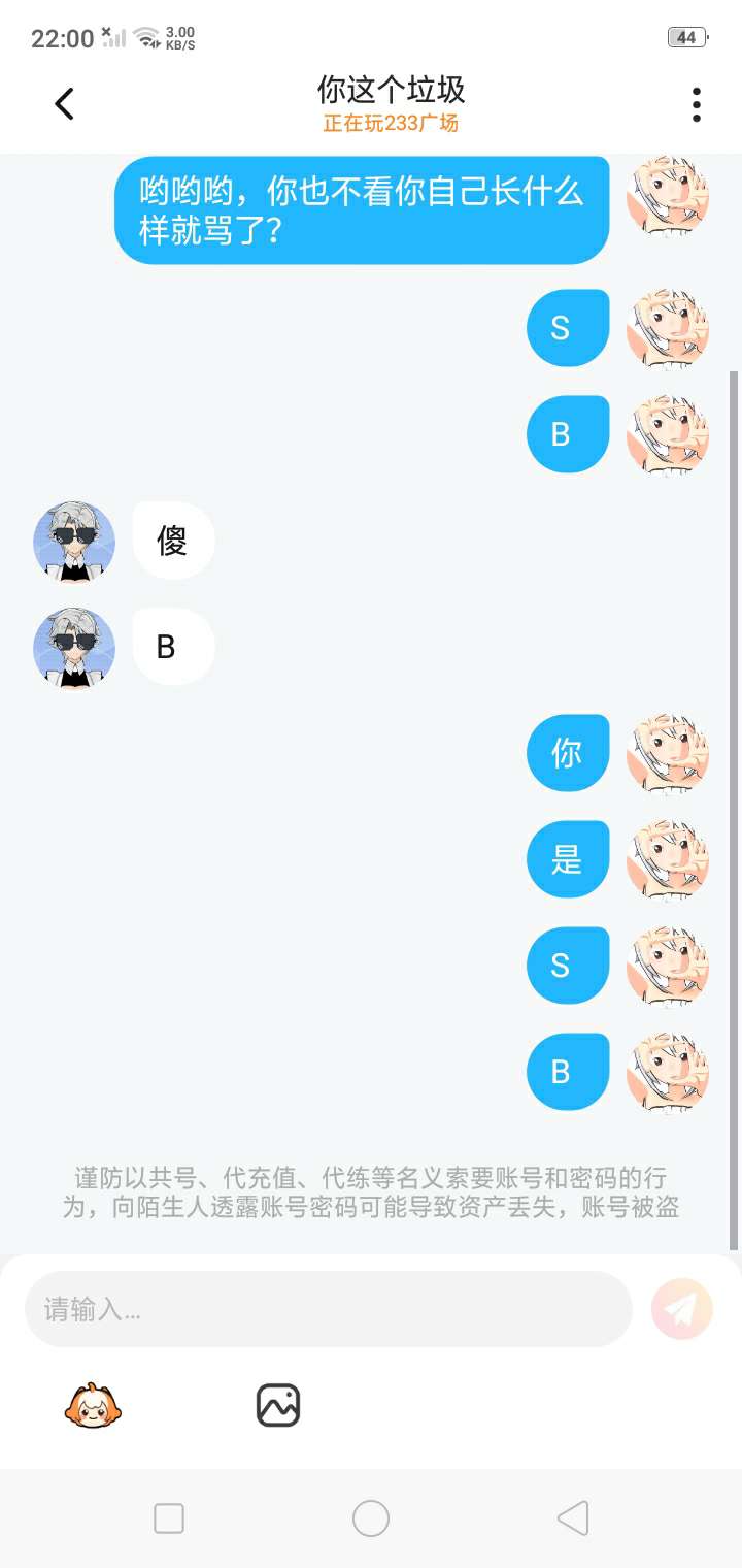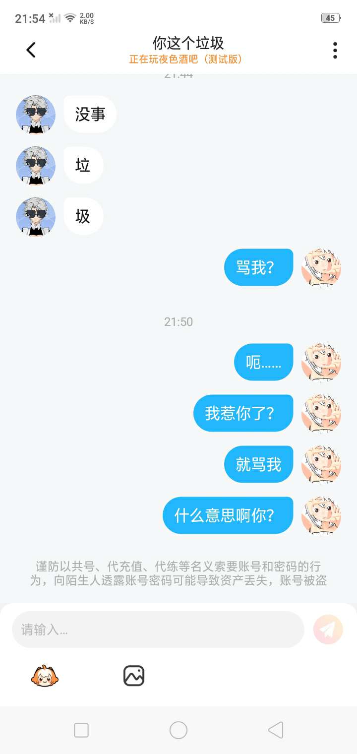 我~真~的~很~怕~呢~你一开始加我,我还以为什么事情,然后我就问你说加我好友有什么事吗?你就回,没事你个垃圾,然后接下来放图片。我还想说不是大哥我认识你吗?你就骂我,就算你是听完老子也不至于随意骂人吧,况且你想骂哪一个人就骂哪一个人,你谁啊?😒😒😒😒😒