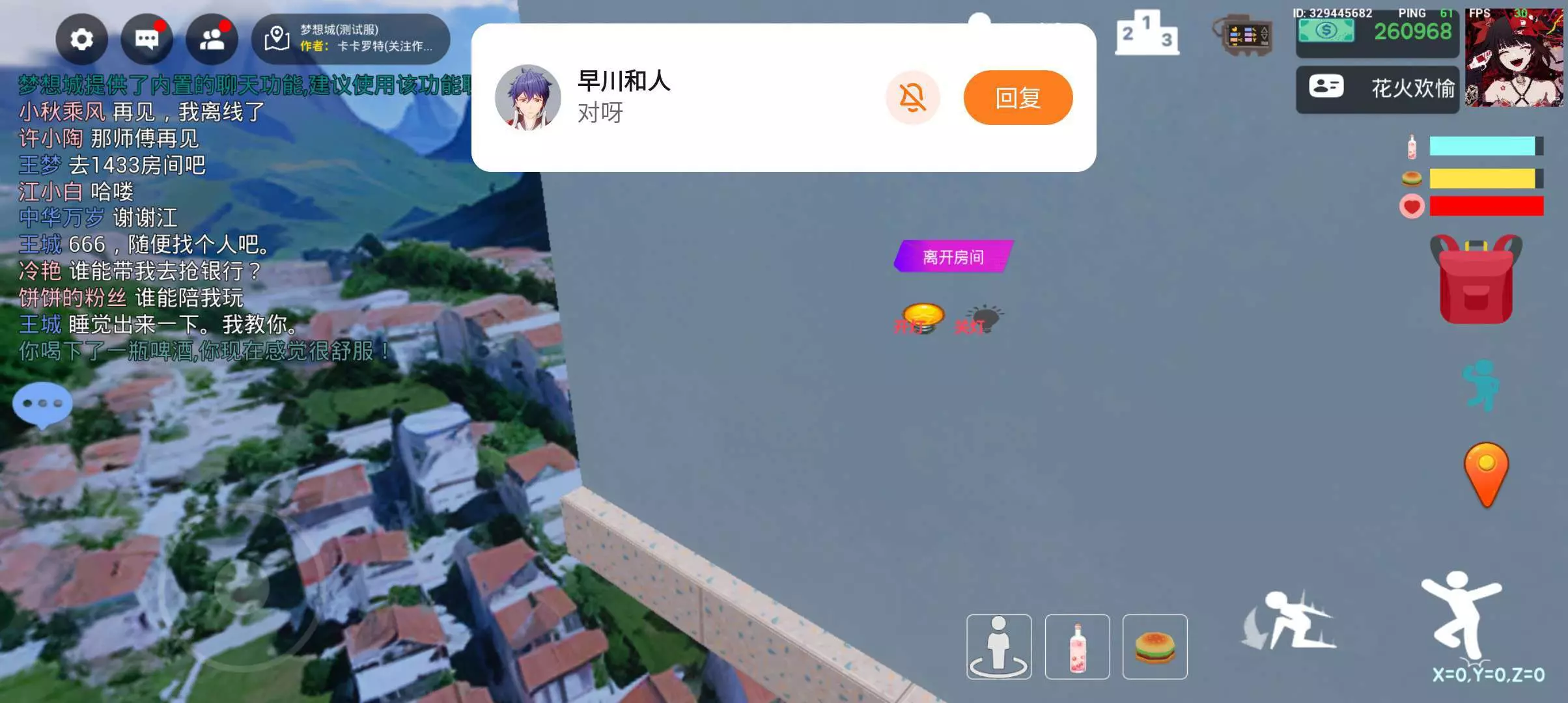 本来是去那1344不多少的房间里吃瓜,然后我去吃饭挂了一会儿,之后,我再进的时候就卡这儿了,我本以为卡1344房间了,结果我发现代可以和房间交互,那时候我想:这不我房吗?之后不管怎么点都无用😱,点回城按扭也没用,6,卡死了😶😶😶