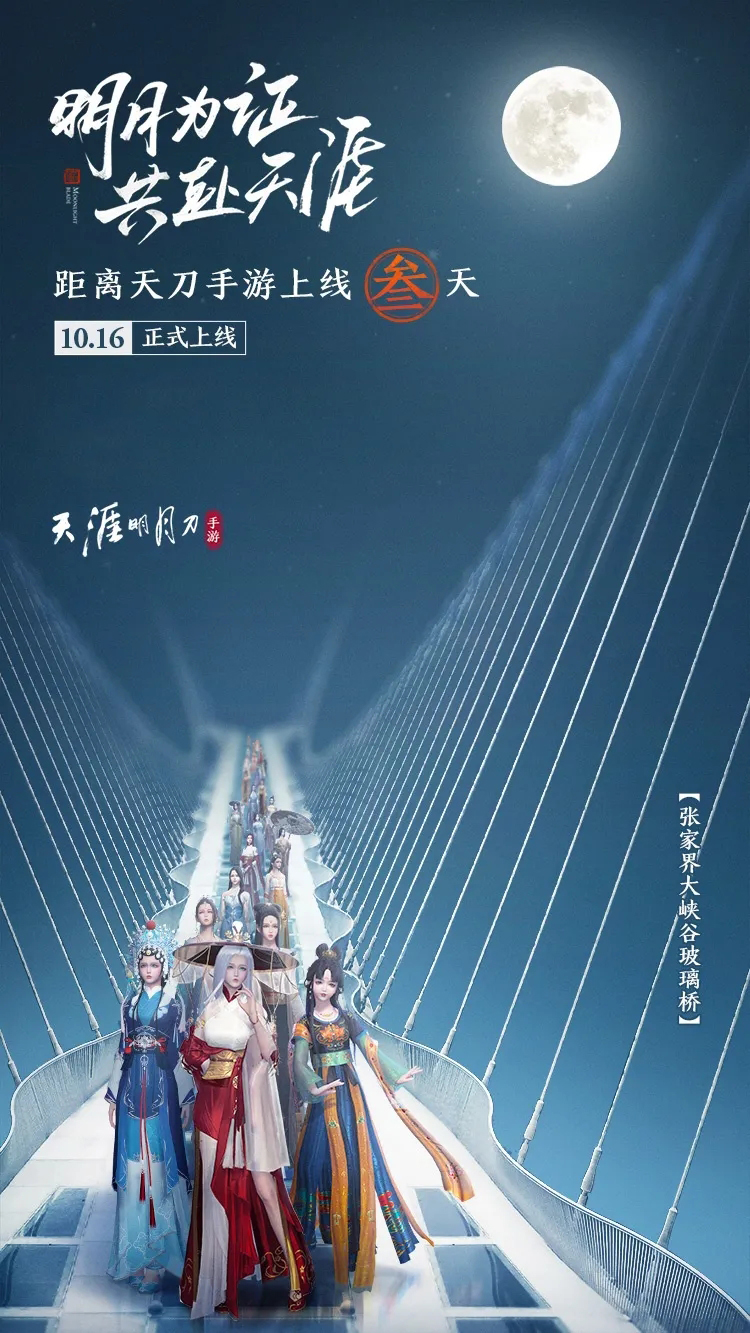 ————转载自官方————刀妹已经坏掉了,满脑袋里只剩下一个想法啦。 预约有礼,锦鲤相伴10月14日,十城明月高悬之际,十城文创锦鲤活动也会同步开启,助力不删档上线冲刺!预约有礼,见者有份,完成预约即可领取专属称号“明月共证”、丰厚道具等全员助力礼包。最终幸运儿“天刀锦鲤”更可以获得张家界、重庆、无锡等十城文旅自由行,与人间梦华、心王·祈年等十大典藏永久华服外观等终极大奖! 不过值得庆幸的是,这样扳着指头数日子的生活很快就要结束啦~距离天刀不删档上线倒计时3天了!据刀妹收到的小道消息称,天刀世界已经做好迎接少侠们的全部准备工作,就等10月16日相聚江湖啦。不过在此之前,还有一件大事,是少侠们无论如何都不能错过的。10月14日18:00,“十城明月”上线盛典暨张家界战略合作发布会隆重举行!将由虎牙直播带来全程线上直播。明月为证,共赴天涯,和刀妹一起见证这一时刻吧!明月为证,共赏国风在“十城明月”主会场张家界,更是有一场令国风爱好者不禁屏息凝神的盛大活动——天刀专场、史上最“高”国风华服大秀。 深渊之上、云端之间的华服秀,千万不要错过直播哟! 来自昨晚通宵彩排小伙伴的图透 不仅如此,本次盛典还邀请了押切、黄靖翔等知名嘉宾,阵容豪华程度堪称占据古风圈的半壁江山,想要捕捉大大们美腻瞬间的少侠们千万不要错过直播哟~大大们有辣~么好看有生之年,可以看到喜欢的大大穿上天刀原创国风华裳,这种快乐简直无法比拟。(大概能跟天刀手游开服划等号了)嘉宾们已经在彩排中,你能看出这是什么外观吗?那么金晚,我们不见不散(●'◡'●) 群侠集结 正片放出 从端游主城开封、杭州,到代表着华夏“东南西北中”的泰山、三亚、敦煌、长白山、北京,以及位于长江上下游的重庆、无锡,以及与天刀展开深度战略合作的张家界,每一座城市都有自身的独特韵味。 刀妹小贴士若想更深入了解十城风情,少侠们可以移步次条鉴赏,刀妹偷偷告诉少侠们,次条有一大波海报哟~ 天刀手游以IP经典符号“明月”为证,耗时两个月的前期筹备,于10月14日在华夏十城共升明月,助力文旅产业的复苏与前行,让少侠们在三次元也能共赏天涯明月、静候江湖花开。最重要的是,现场还有天刀群侠团正片放出!看双阵营代言人月下对决;听阿朵演绎《一曲天涯》;与薇娅viya 一起唤醒心中的侠客梦··· ···遗憾的是,由于种种限制本次活动不对外售票,没有办法去现场打卡。但少侠们也不用担心,和刀妹一起看直播吧!