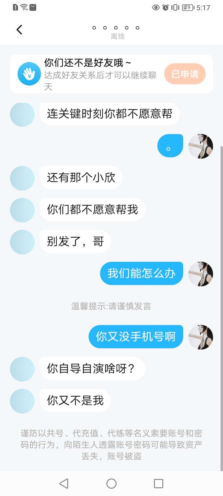 咱们现在没关系我登你号干嘛?况且我把你密码都忘了.自己被盗号还怪我.我还能一边盗号一边给你发消息啊😂你~自~导~自~演~啥~啊~