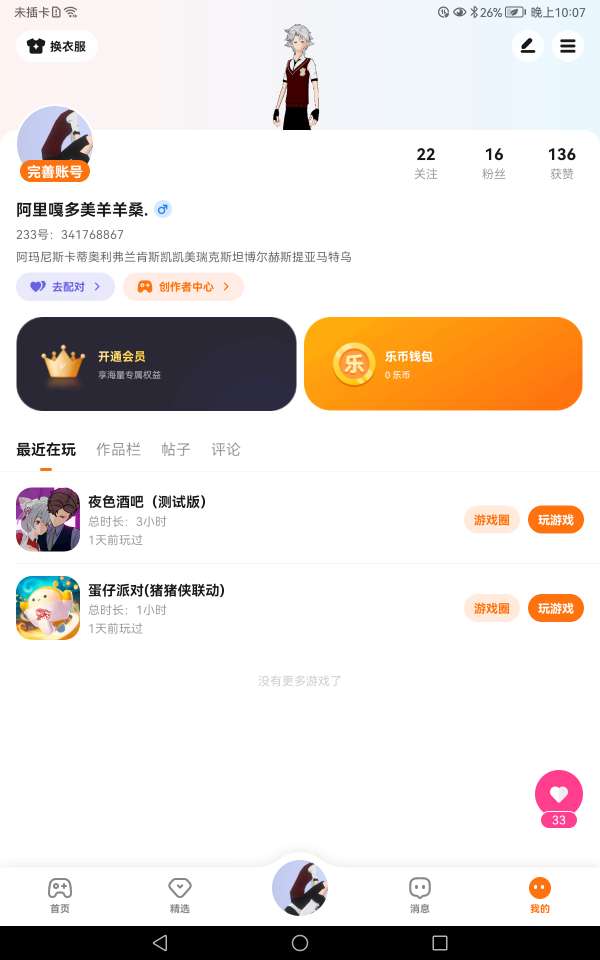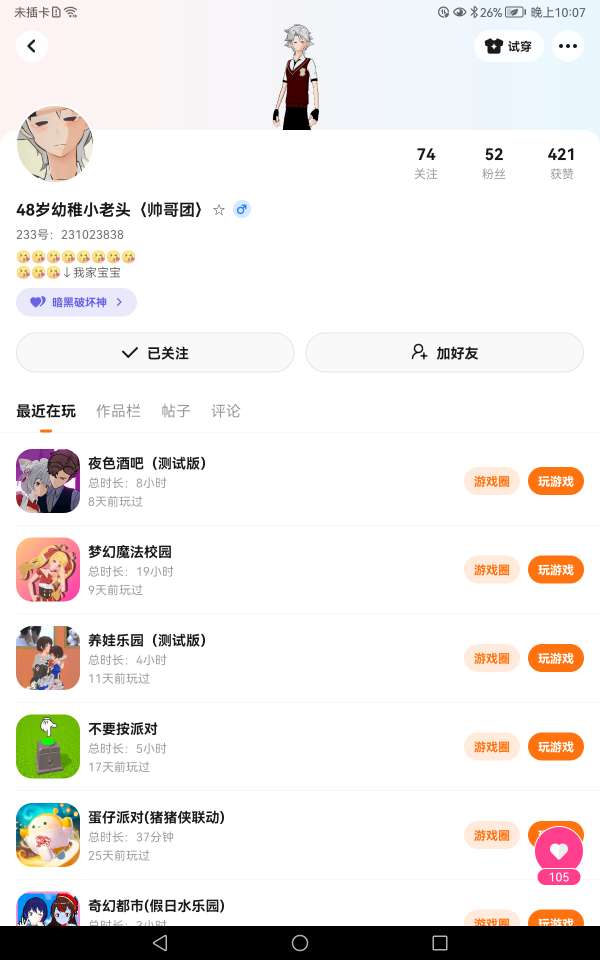 我从前有一个朋友他是男的我是女的,本来每次就照平常一样玩,可是有一次号丢了朋友也没了,包括他