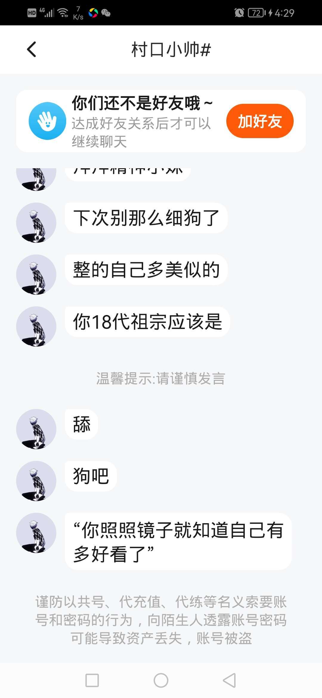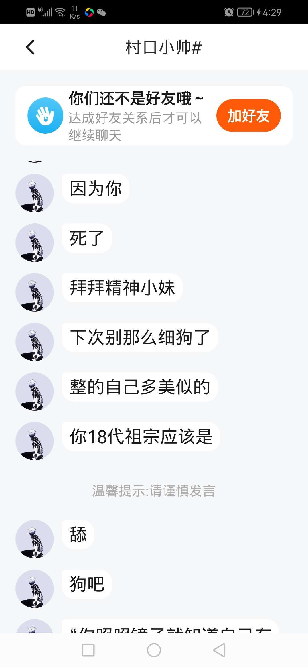 那个时候是村口小帅先骂我们女生丑的,然后我开始骂他了,最后他加我好友骂我
